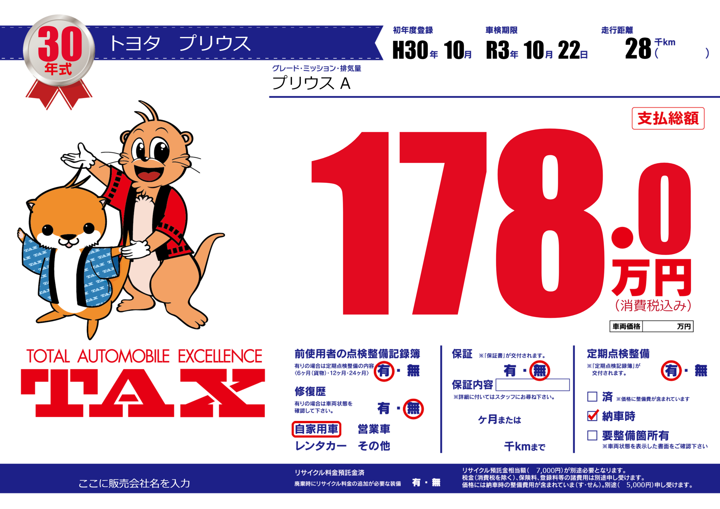 | 車名 | トヨタ プリウス | グレード ミッション 排気量 |