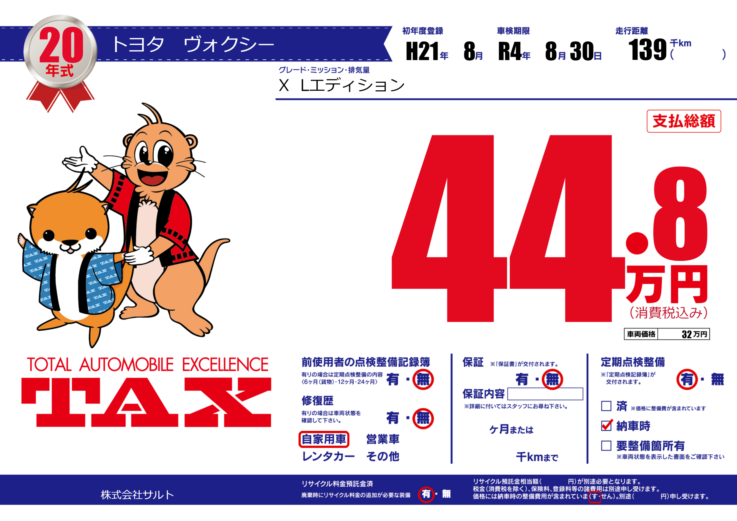 | 走行キロ | 13.9万km | 初年度登録 | H21年8月 |