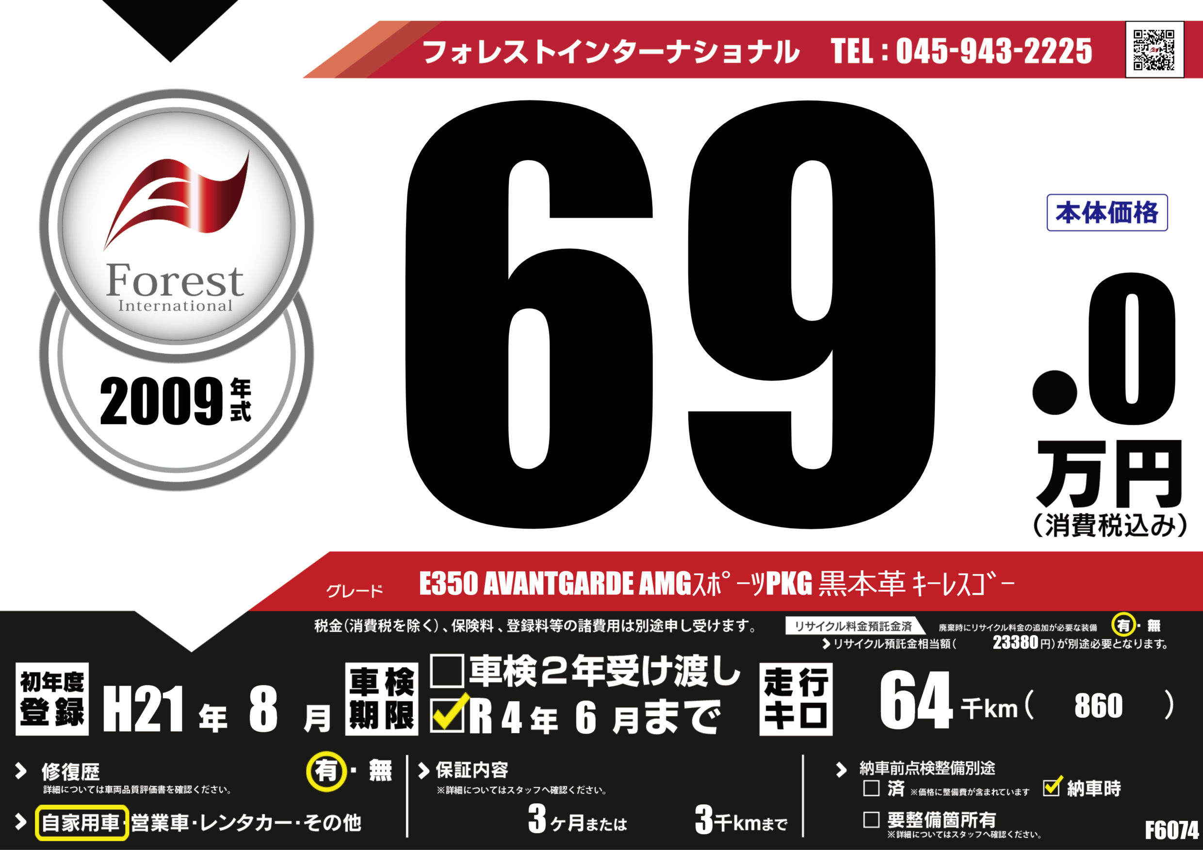 | 走行キロ | 6.4万km | 初年度登録 | H21年8月 |