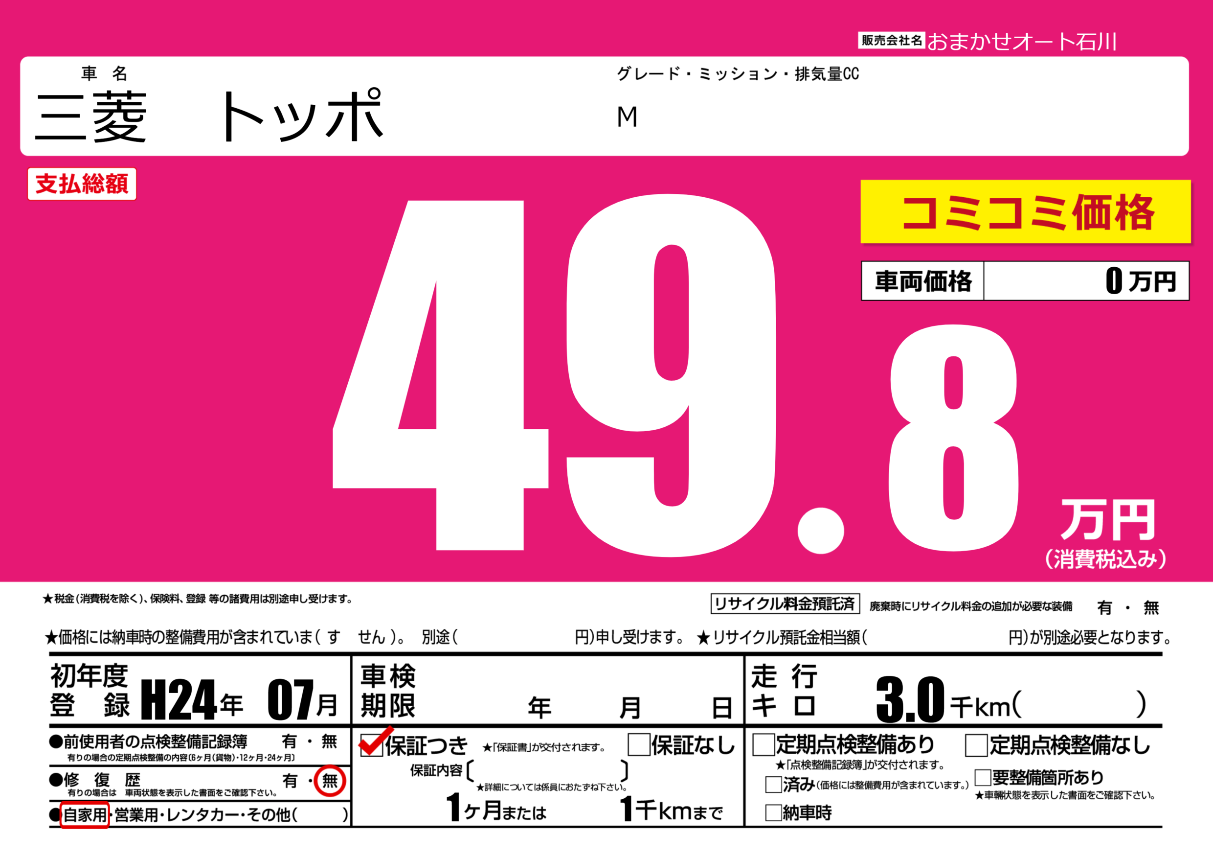 | 車名 | 三菱 トッポ | グレード ミッション 排気量 |