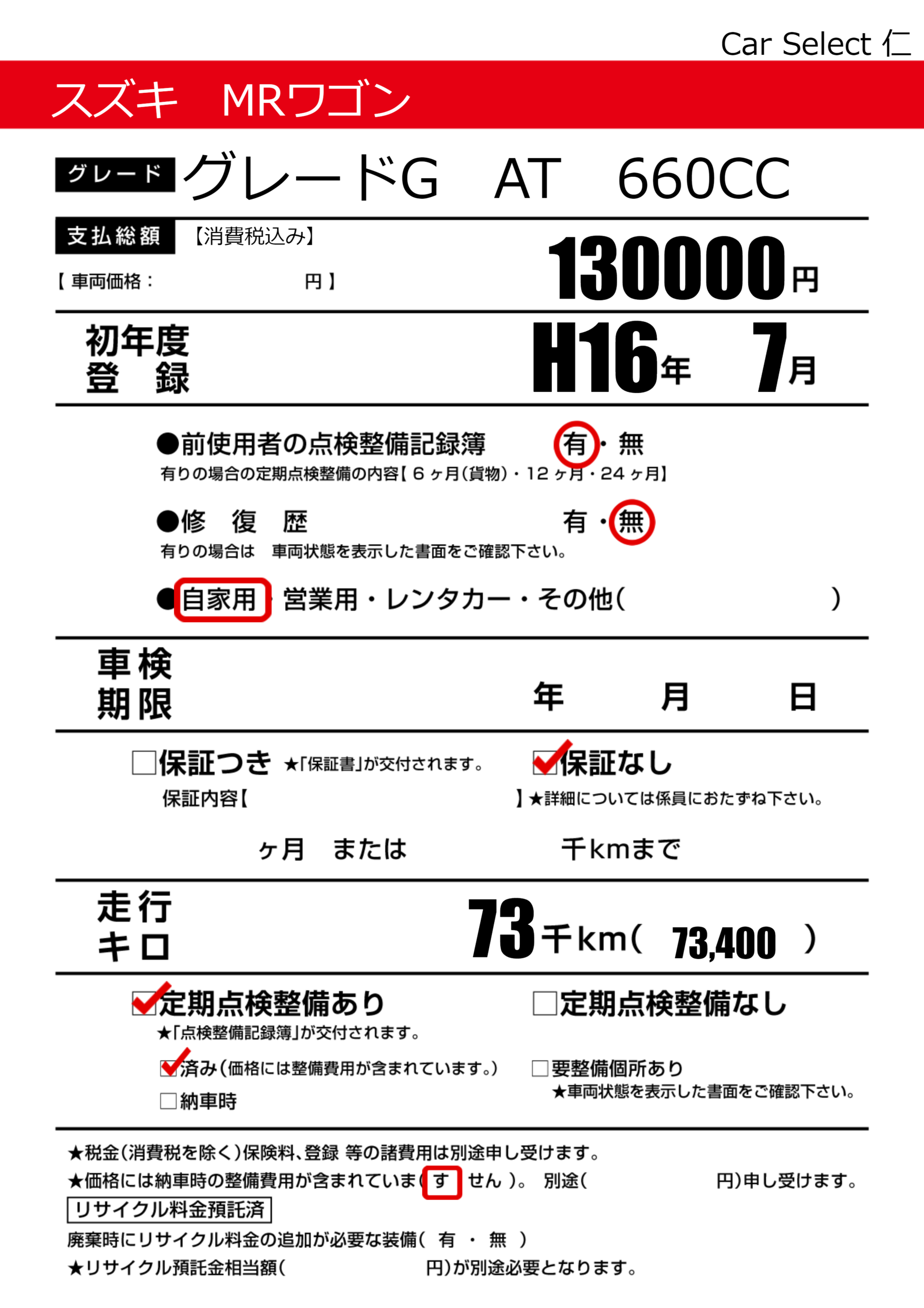 | 定期点検整備 | 定期点検整備あり 定期点検整備済み | ||
