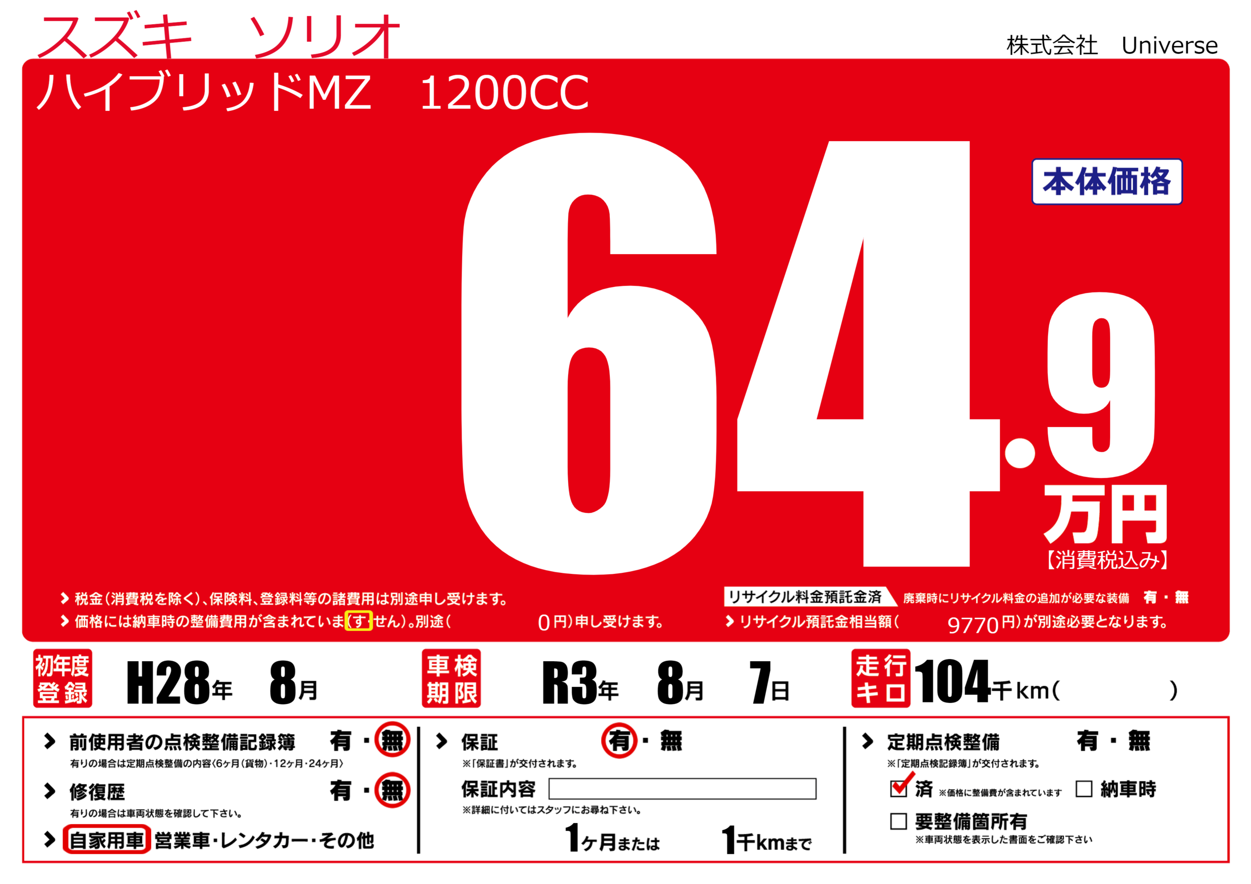 | 車名 | スズキ ソリオ | グレード ミッション 排気量 |
