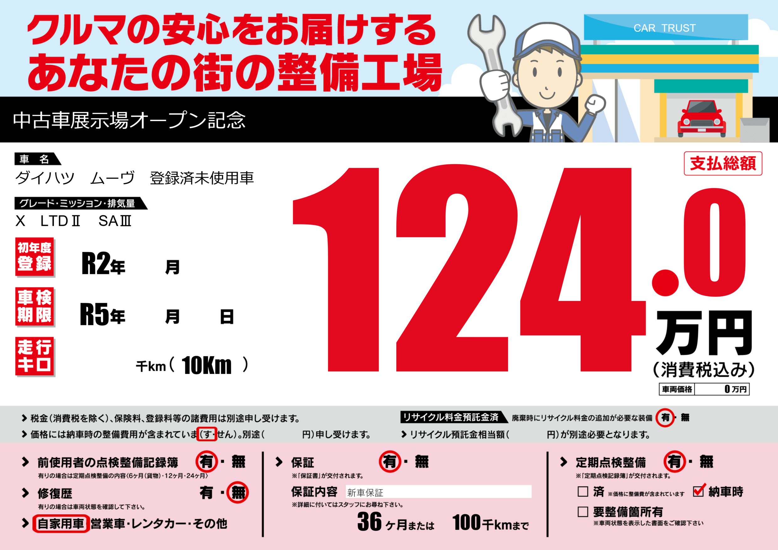 保証付き 保証内容(新車保証) 36ヶ月または(100)千kmまで |