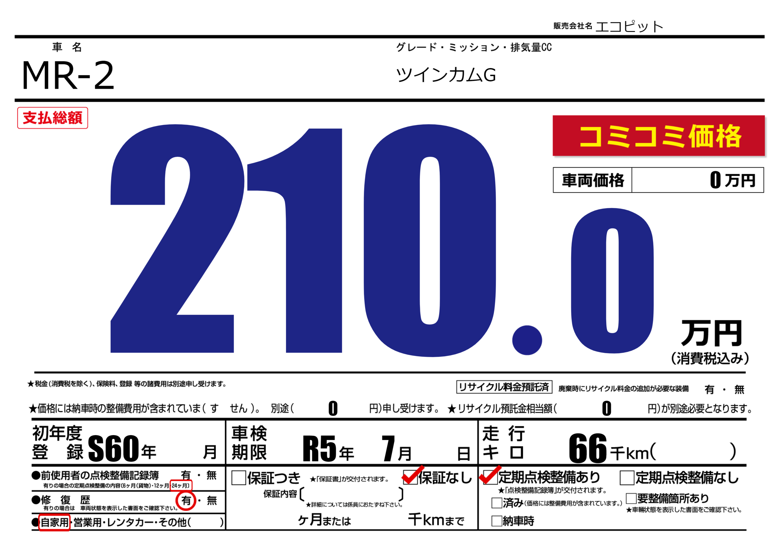 | 車名 | MR-2 | グレード ミッション 排気量 |
