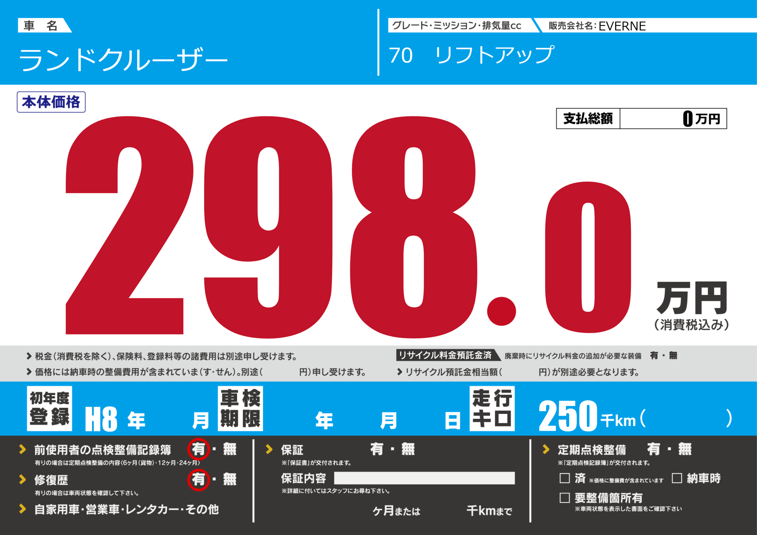 | 走行キロ | 25万km | 初年度登録 | H8年---月 |