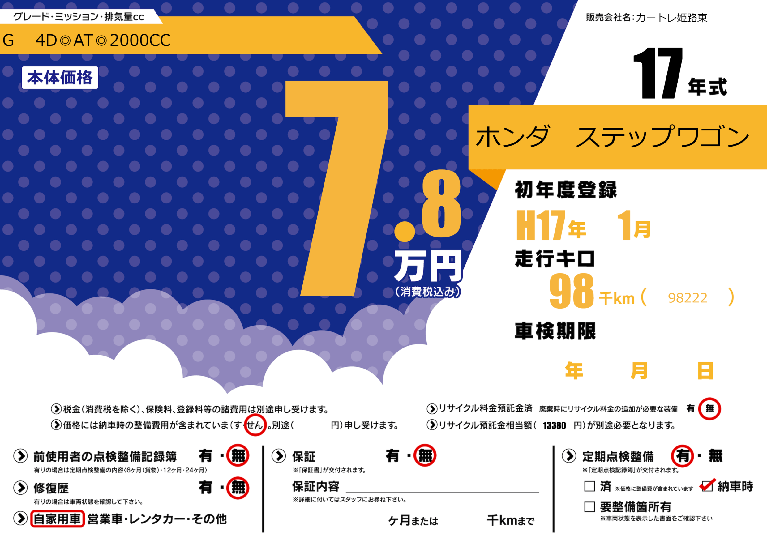 | 走行キロ | 9.8万km | 初年度登録 | H17年1月 |