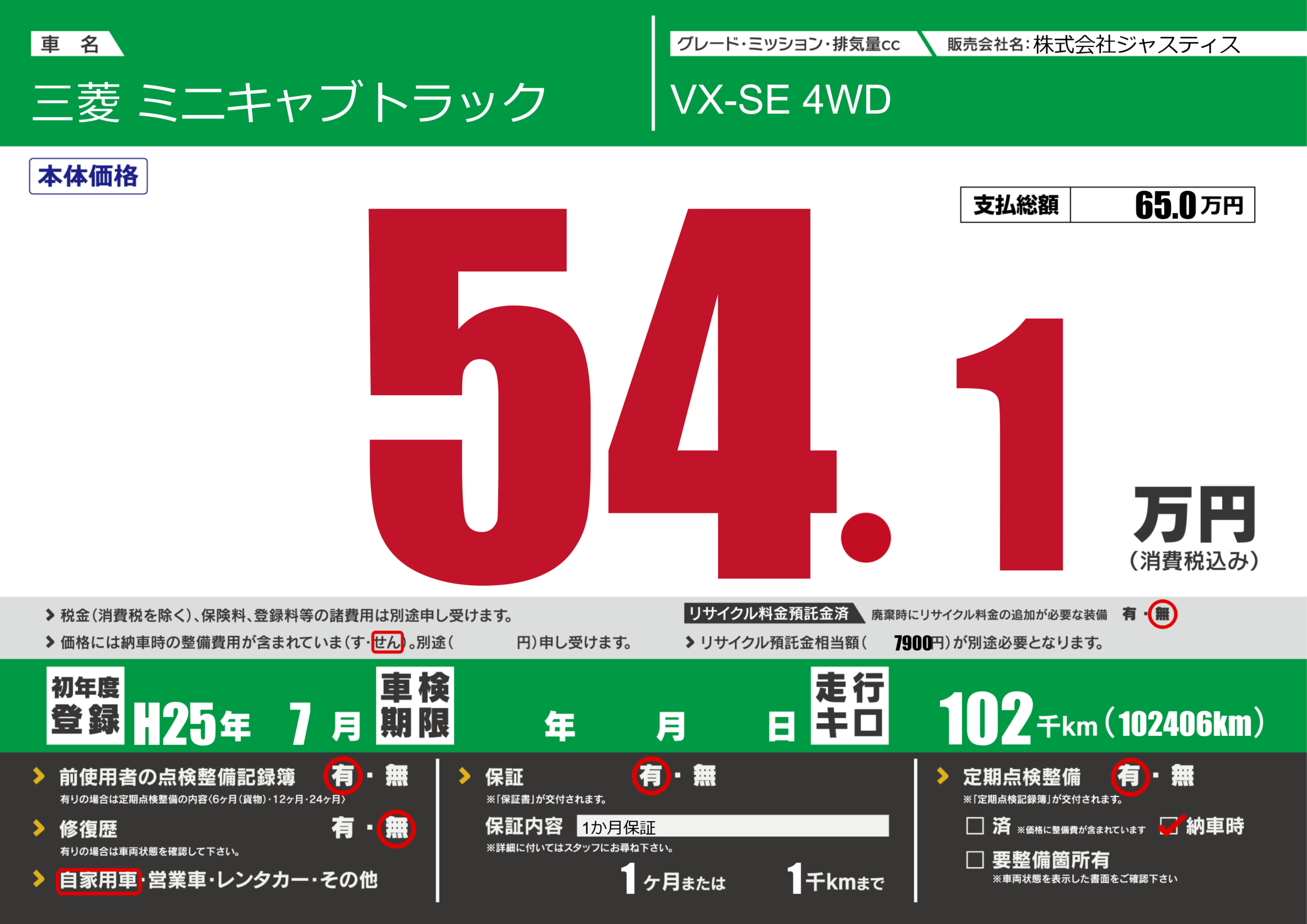 | 定期点検整備 | 定期点検整備あり 納車時あり | ||