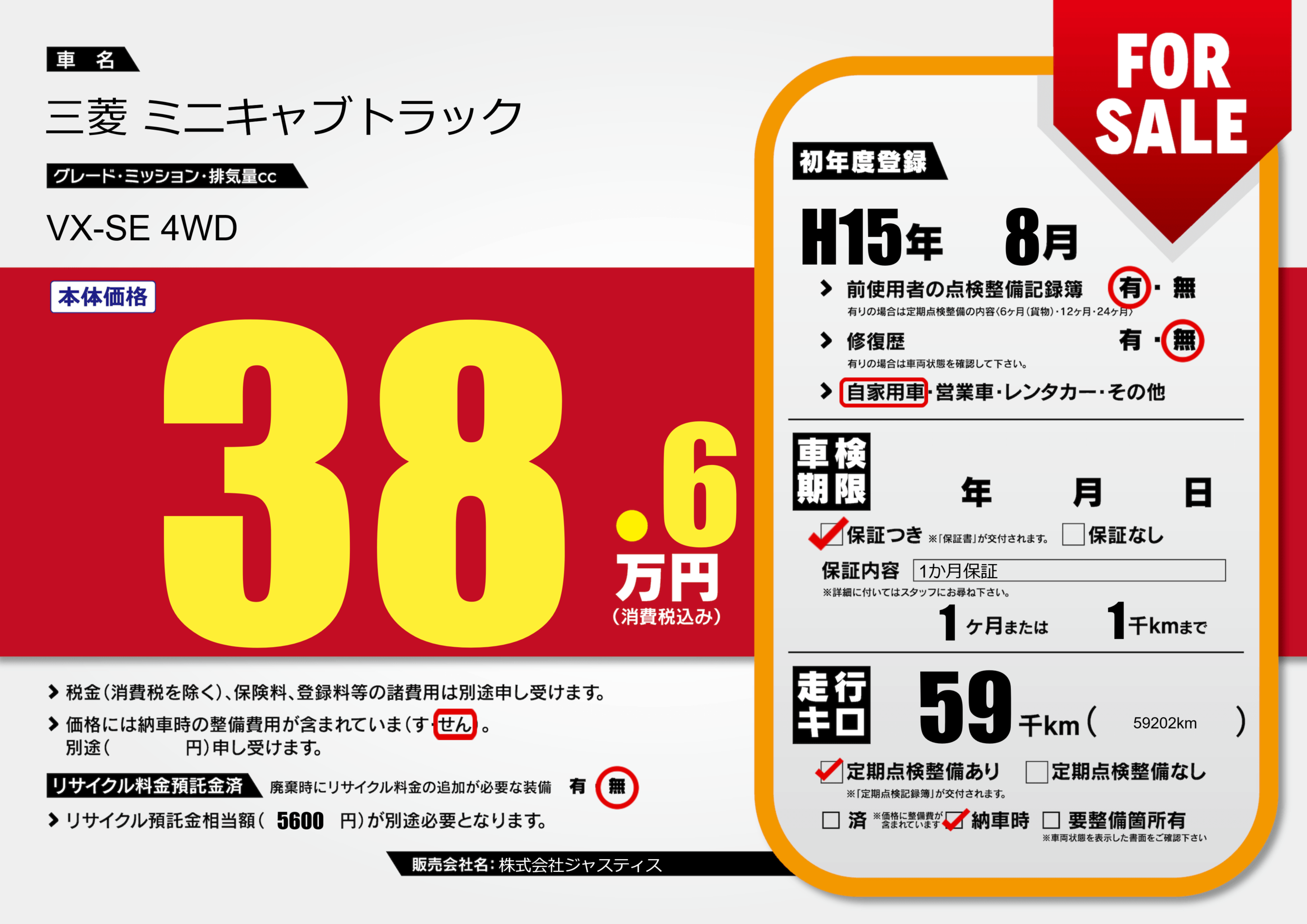 | 走行キロ | 5.9万km | 初年度登録 | H15年8月 |