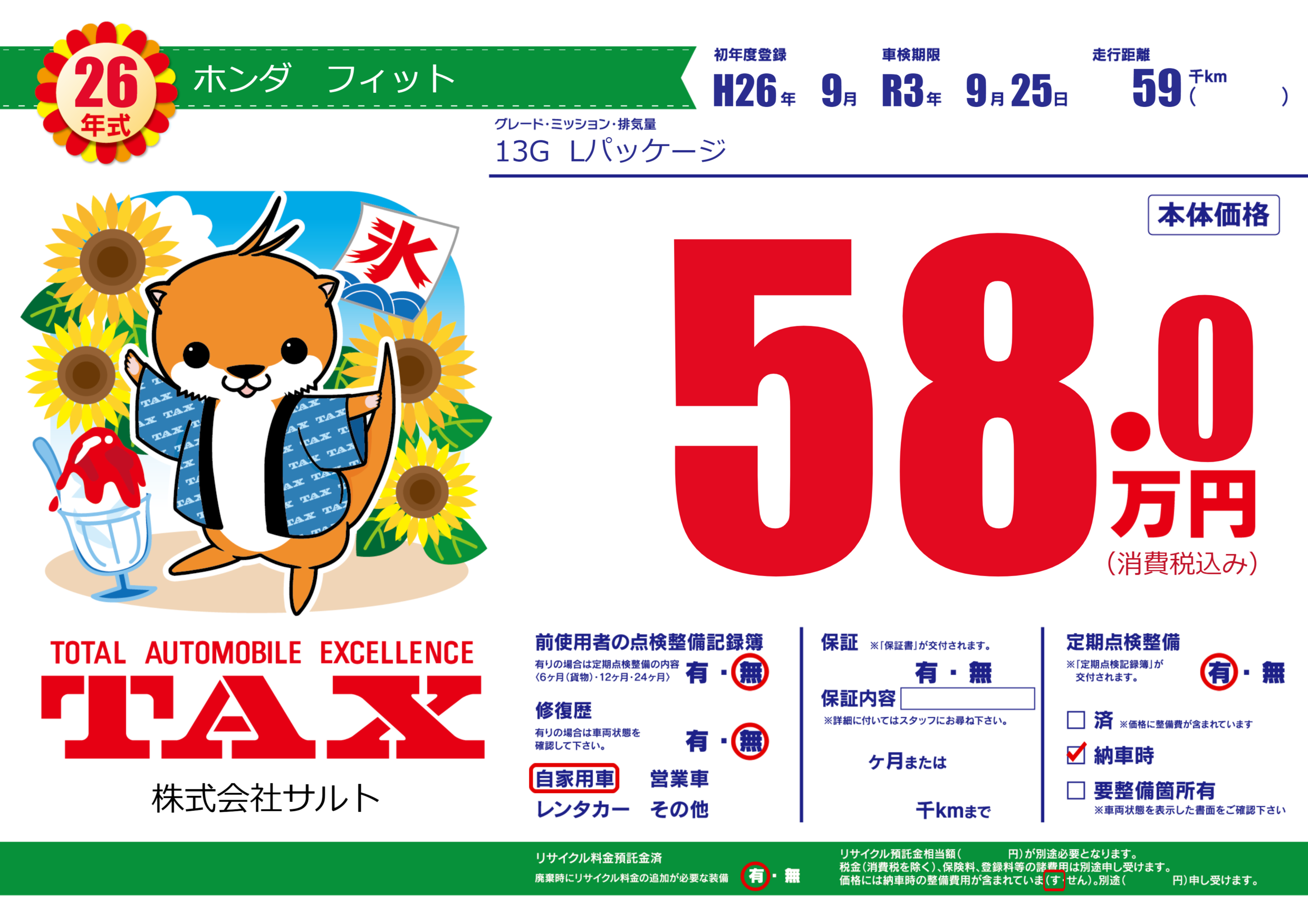 | 走行キロ | 5.9万km | 初年度登録 | H26年9月 |