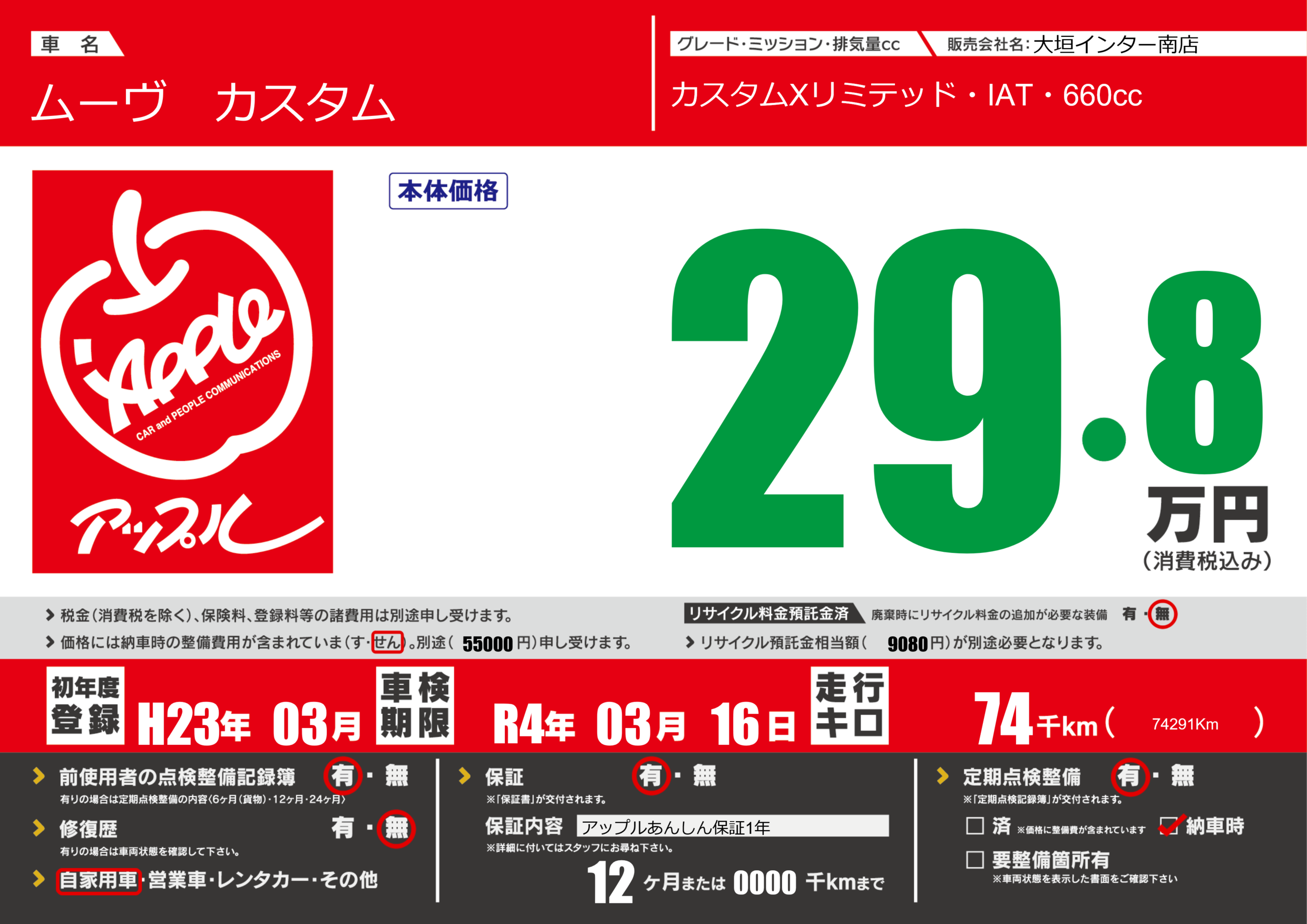 | 定期点検整備 | 定期点検整備あり 納車時あり | ||