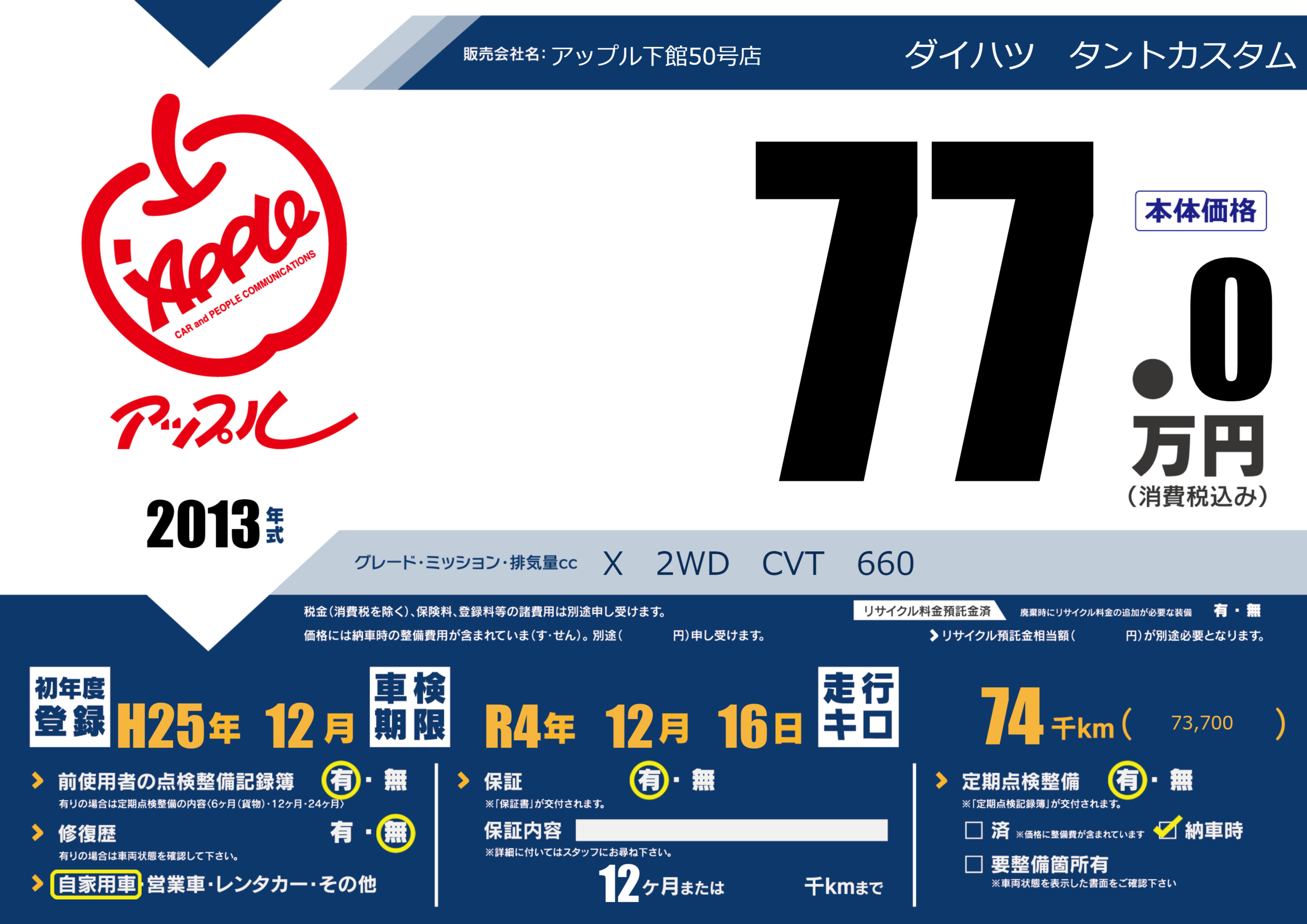 | 定期点検整備 | 定期点検整備あり 納車時あり | ||