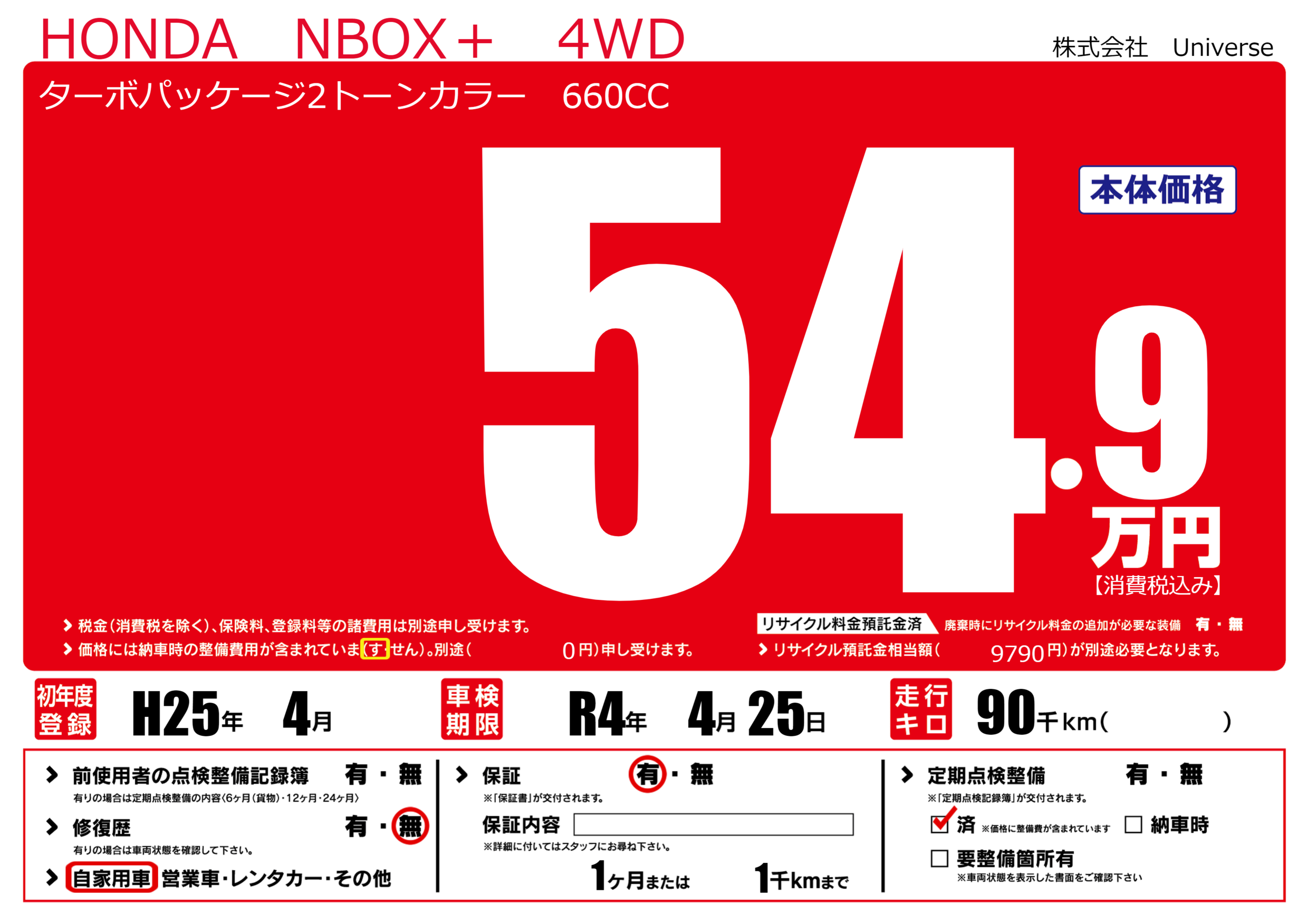 | 車名 | HONDA NBOX+ 4WD | グレード ミッション 排気量 |