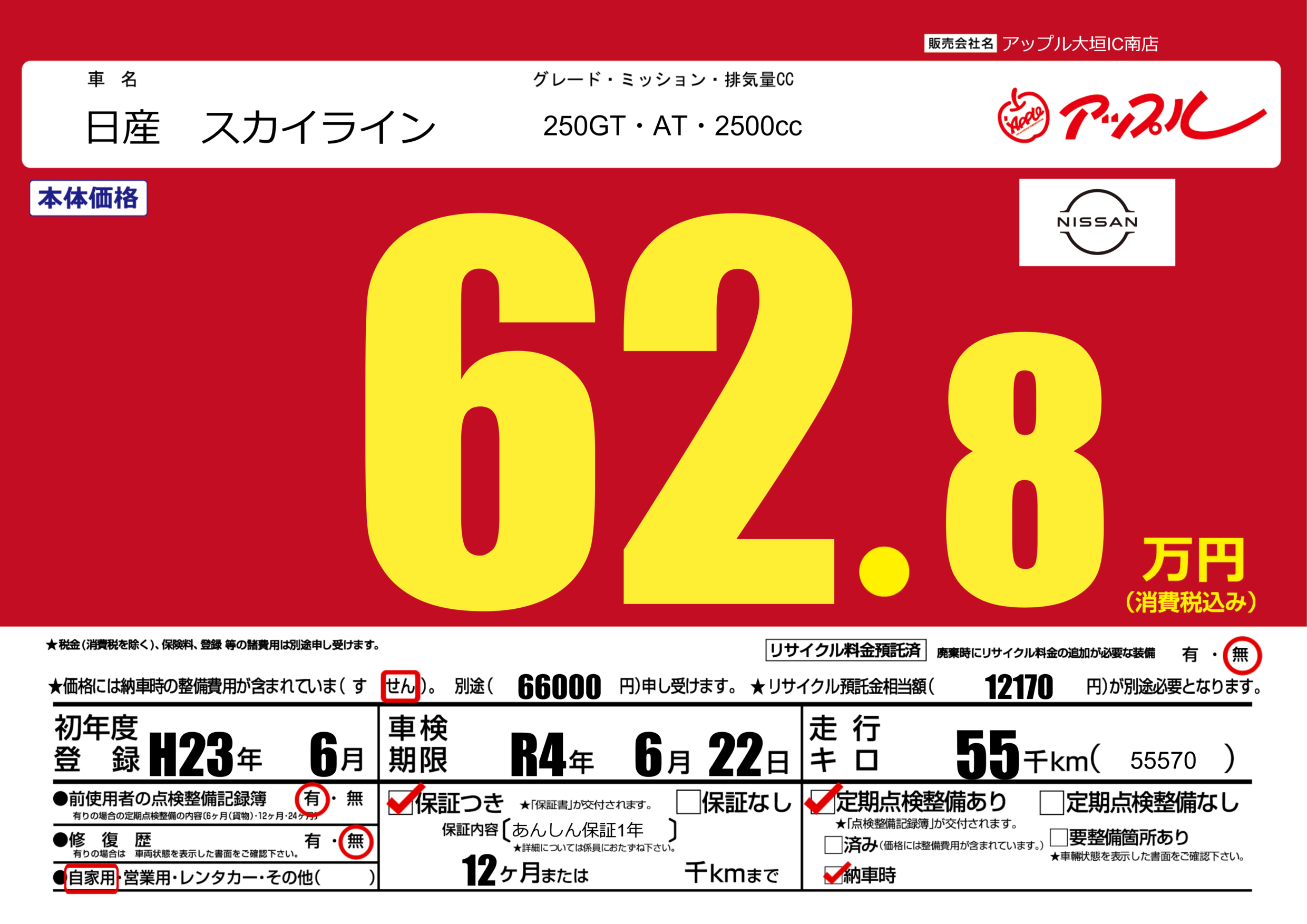 | 車名 | 日産 スカイライン | グレード ミッション 排気量 |