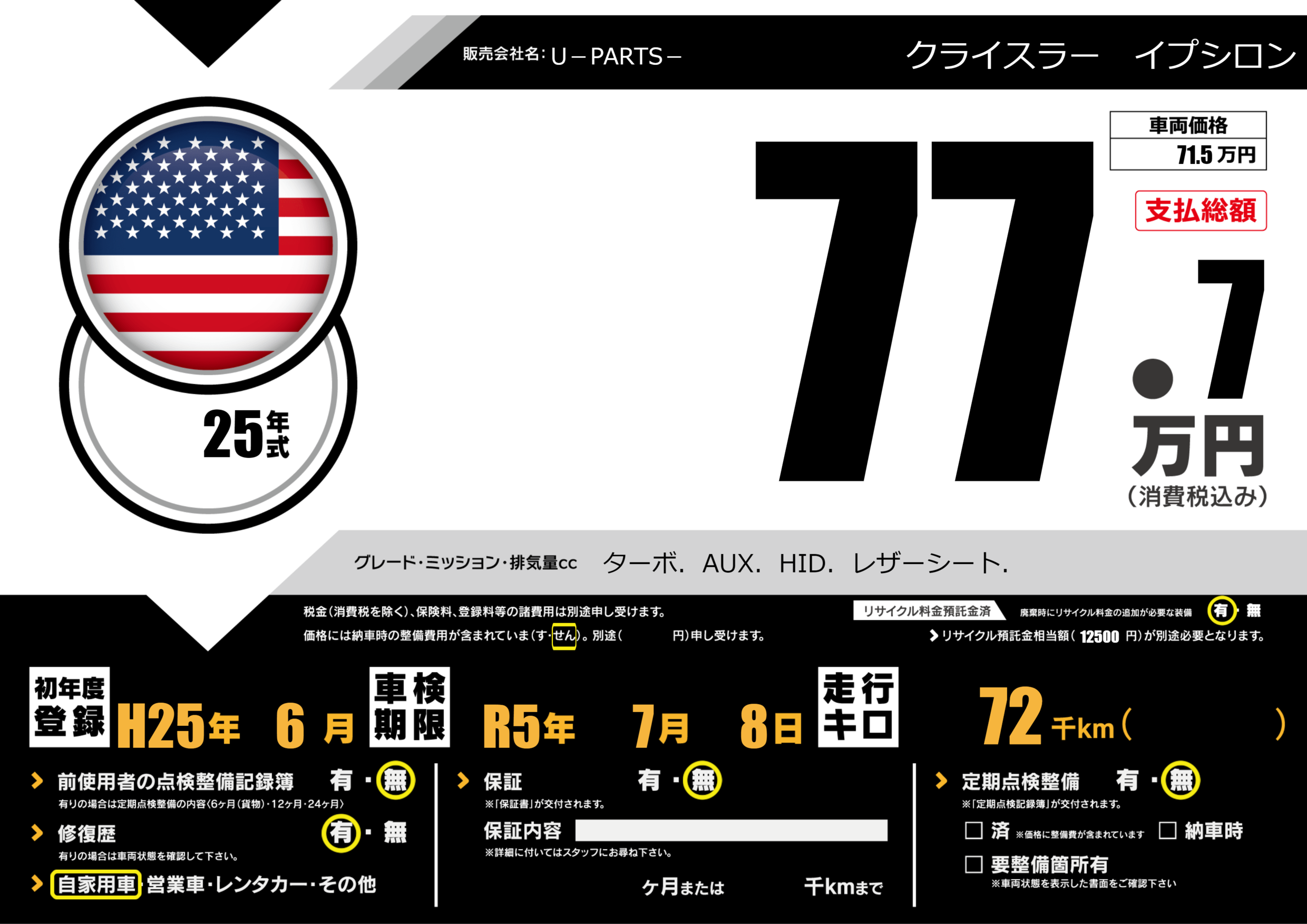 | 車名 | クライスラー イプシロン | グレード ミッション 排気量 |