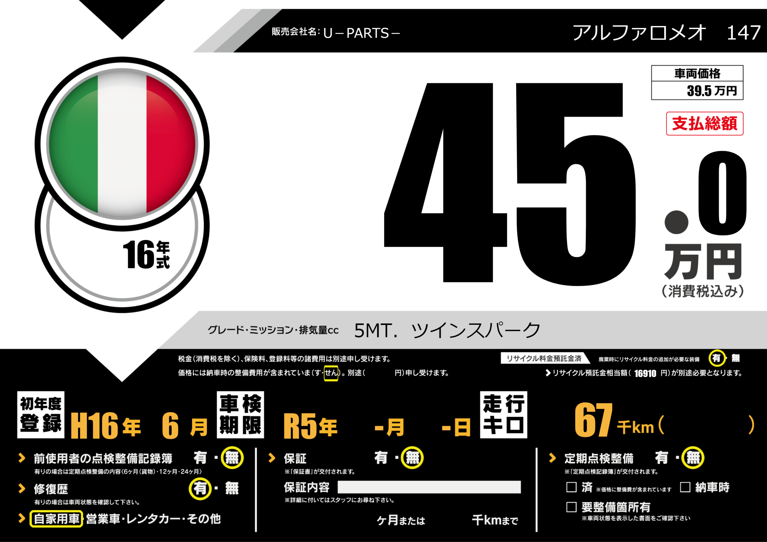 | 車名 | アルファロメオ 147 | グレード ミッション 排気量 |