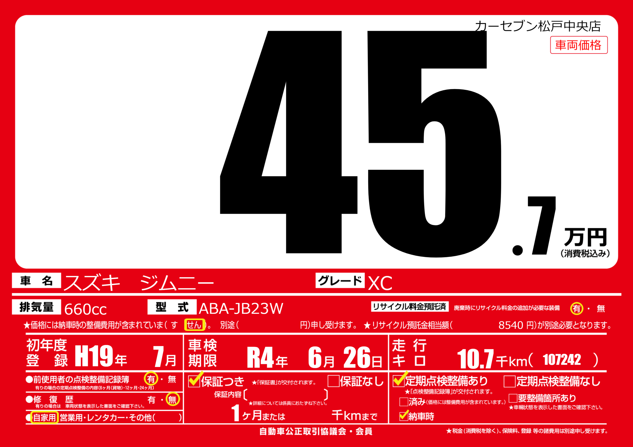 | 車名 | スズキ ジムニー | グレード ミッション 排気量 |