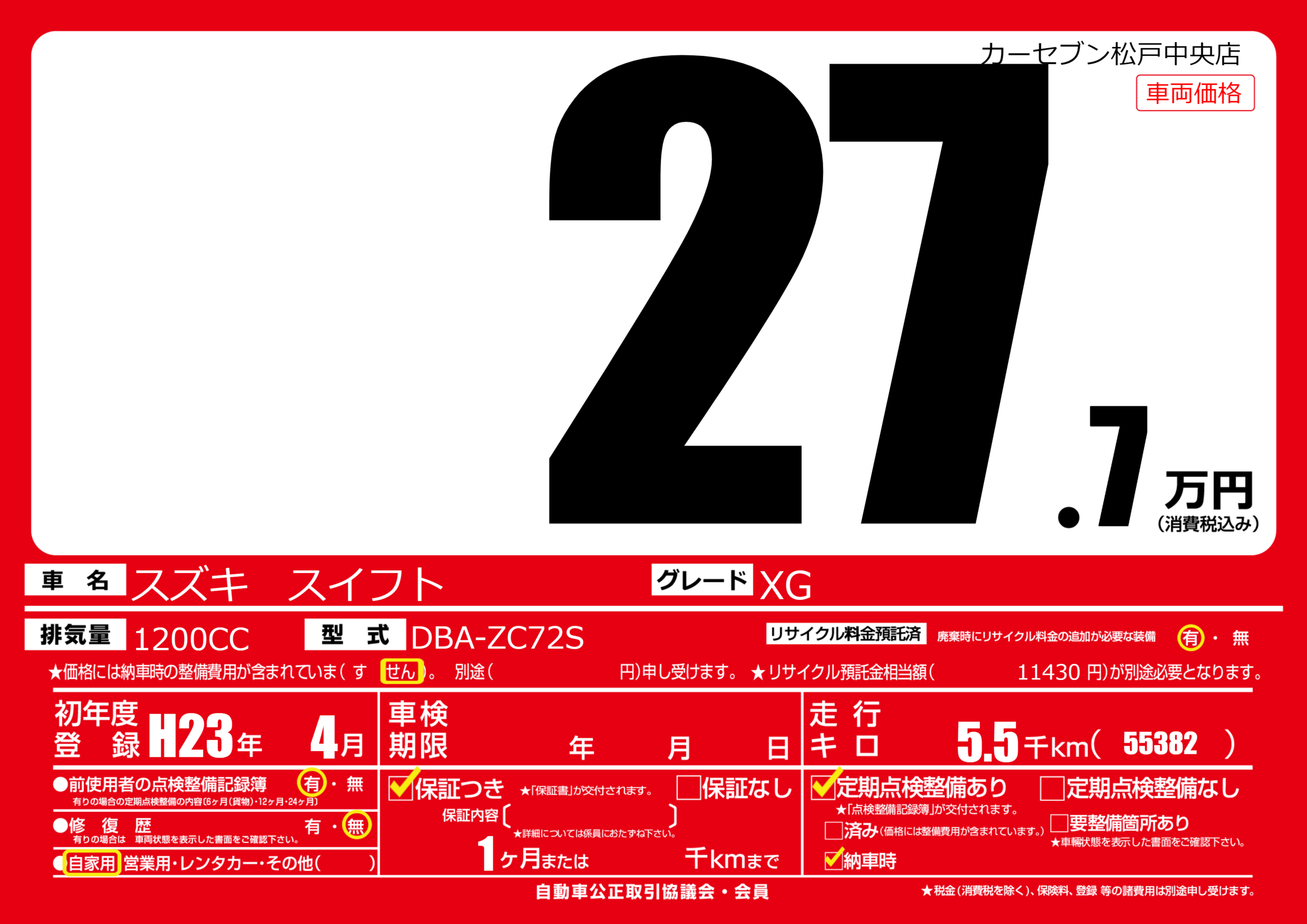 | 車名 | スズキ スイフト | グレード ミッション 排気量 |