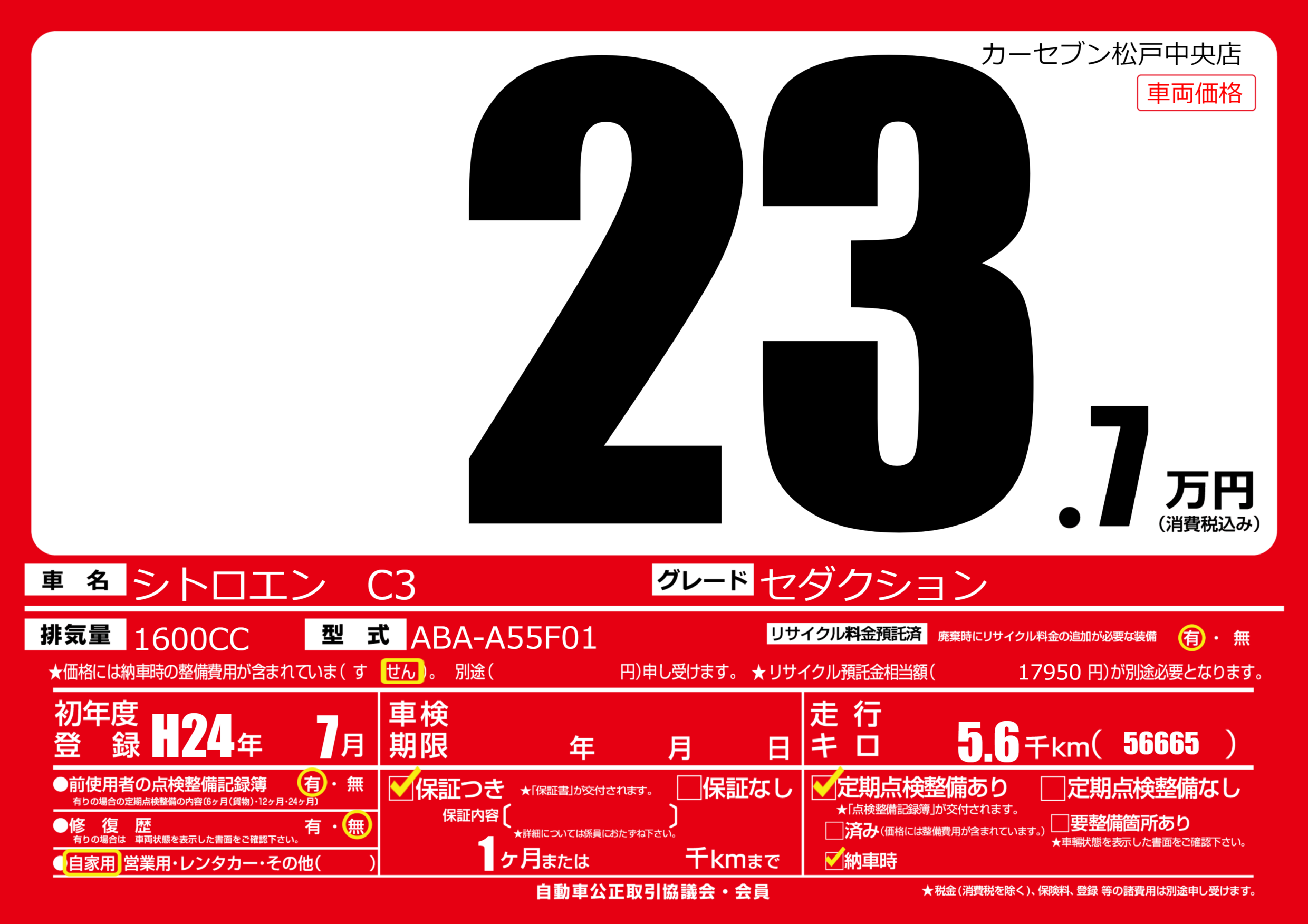 | 車名 | シトロエン C3 | グレード ミッション 排気量 |