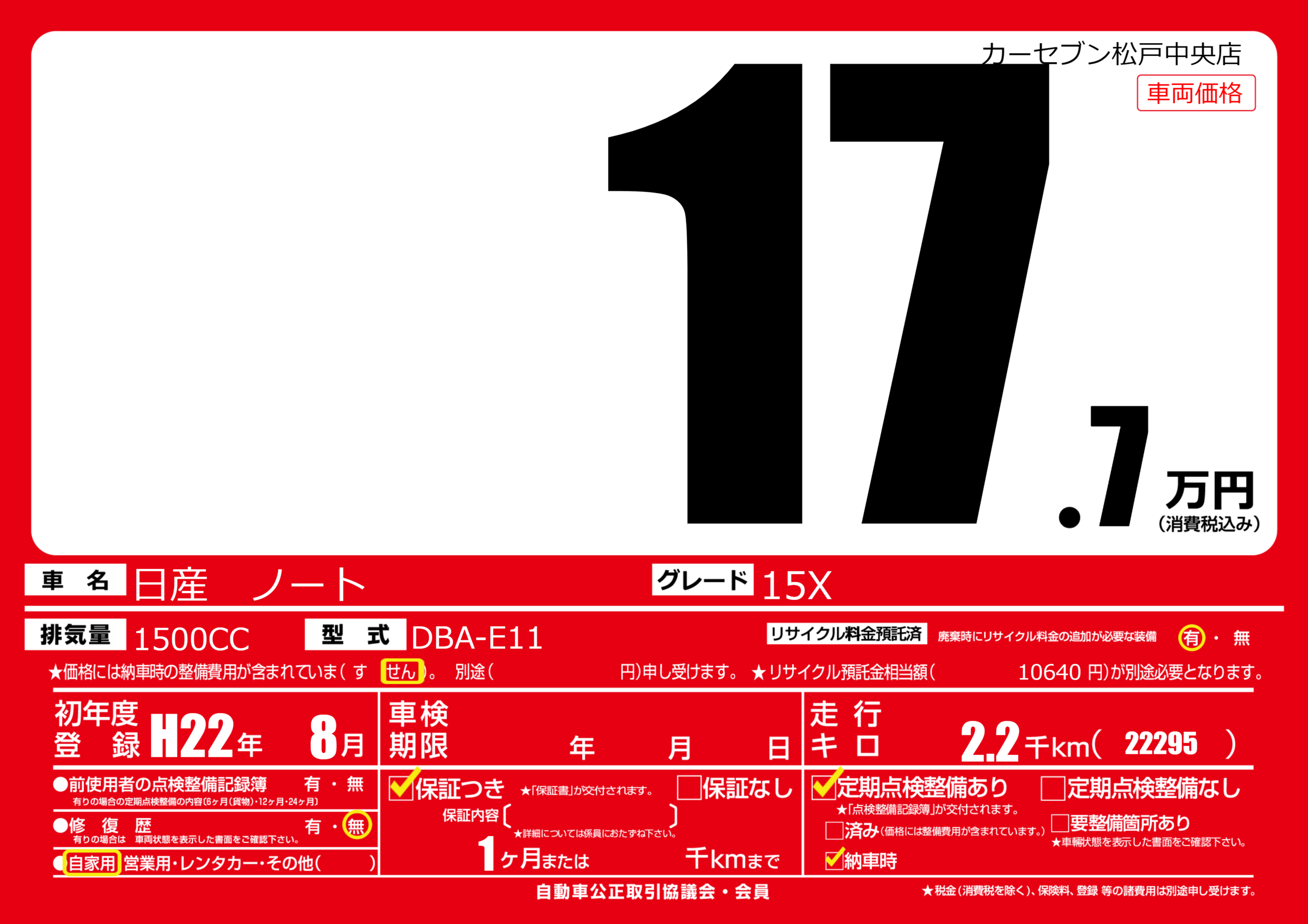 | 車名 | 日産 ノート | グレード ミッション 排気量 |