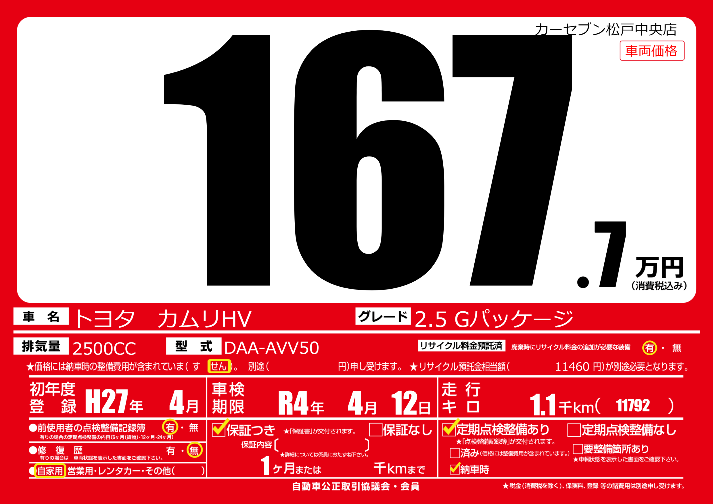 | 車名 | トヨタ カムリHV | グレード ミッション 排気量 |
