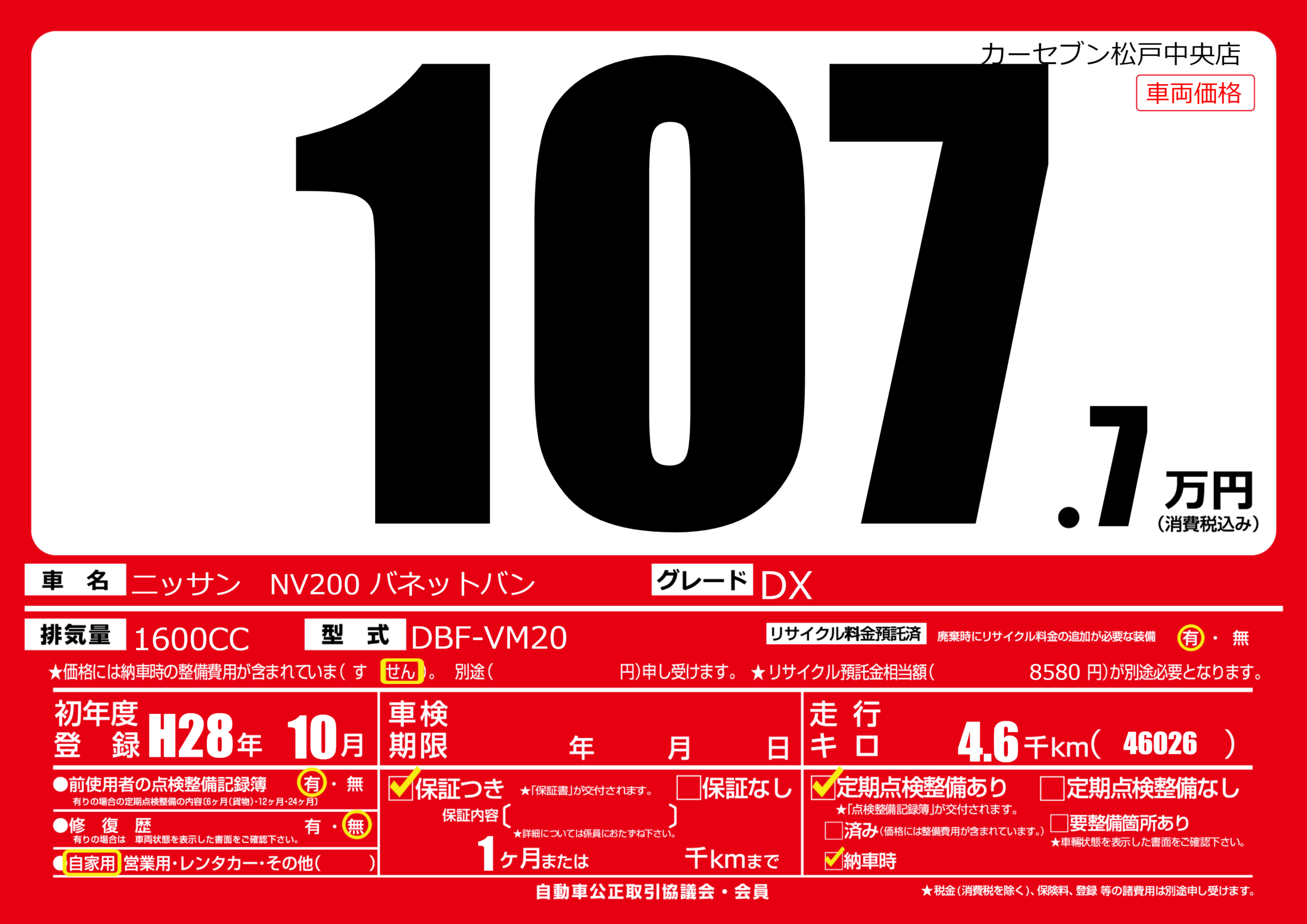 | 車名 | ニッサン NV200 バネットバン | グレード ミッション 排気量 |