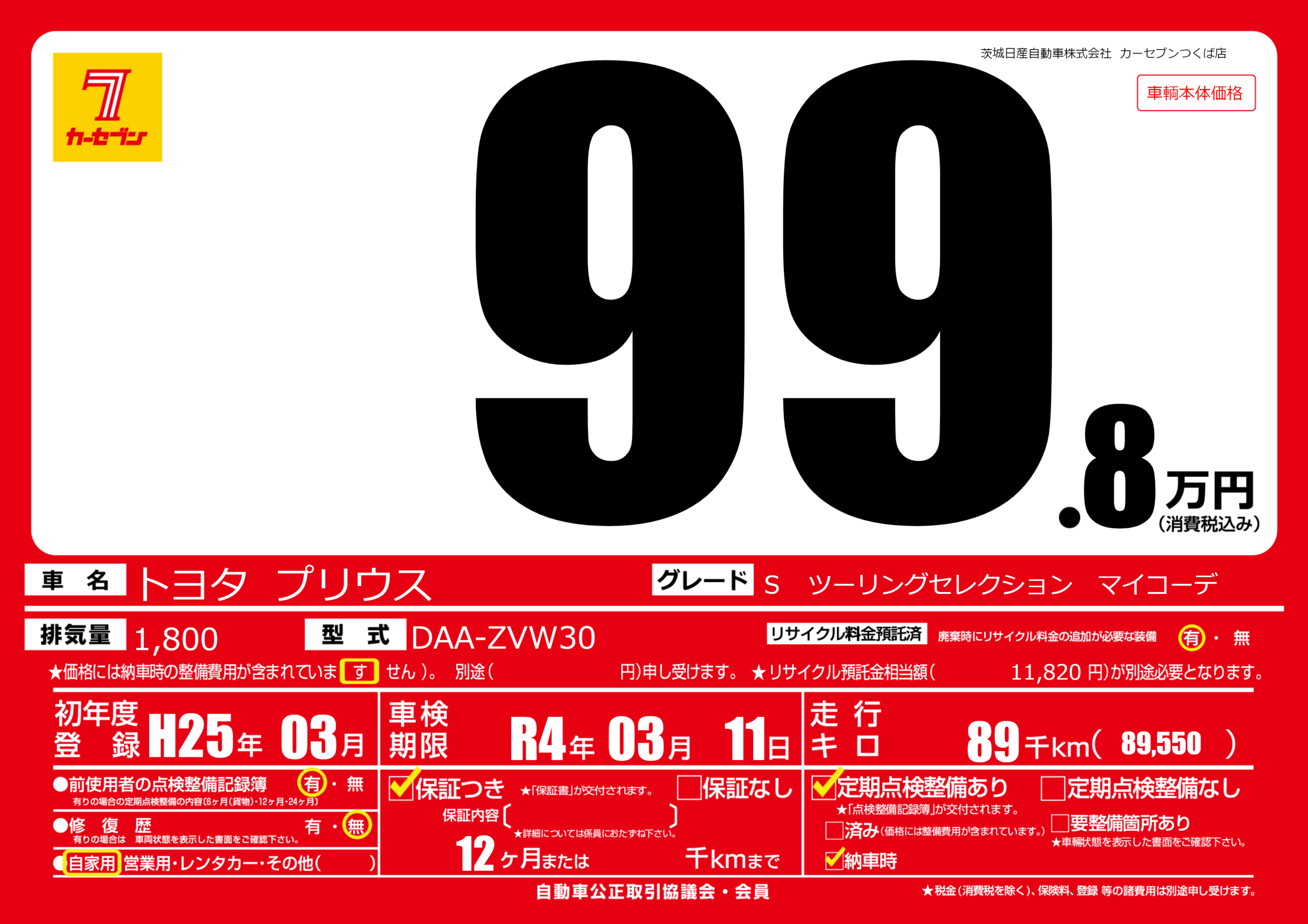 | 車名 | トヨタ プリウス | グレード ミッション 排気量 |