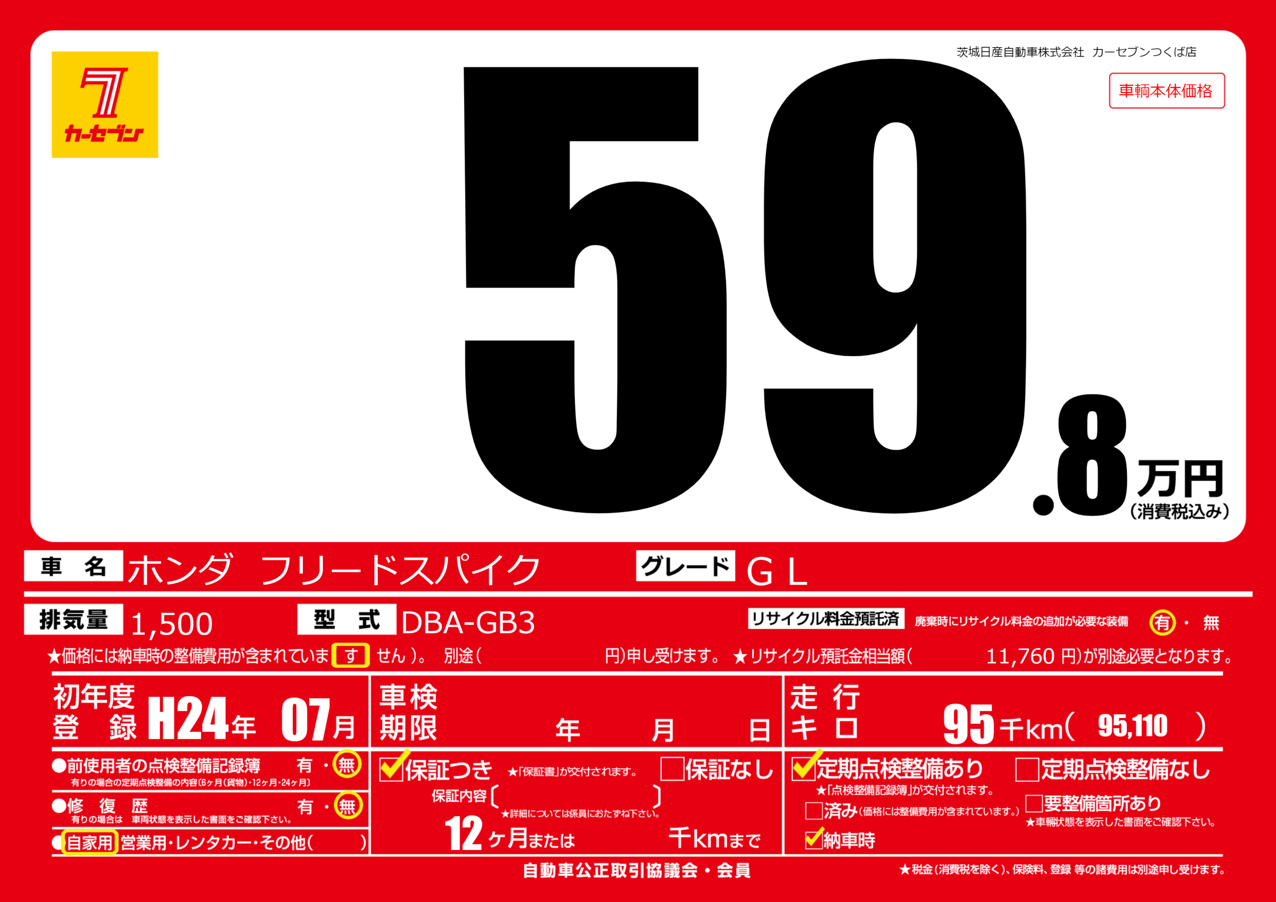 | 走行キロ | 9.5万km | 初年度登録 | H24年07月 |