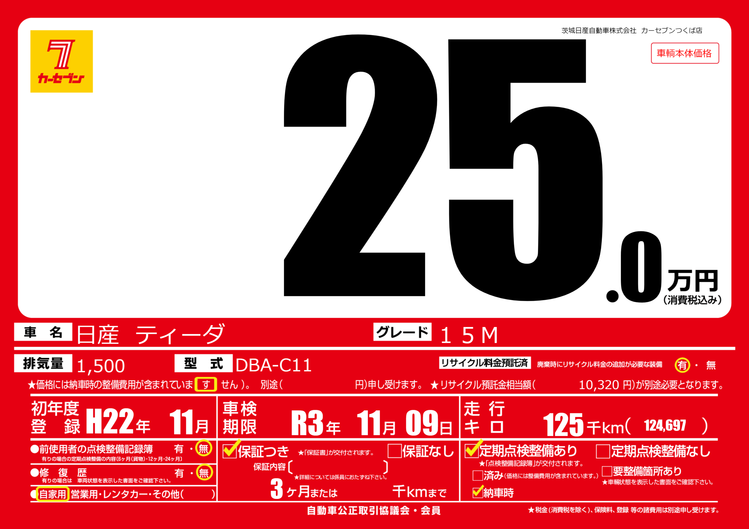 | 車名 | 日産 ティーダ | グレード ミッション 排気量 |