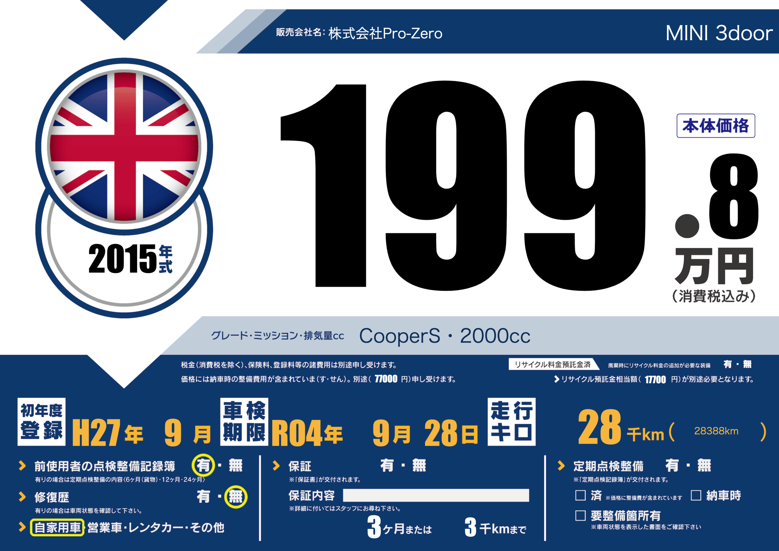 | 車名 | MINI 3door | グレード ミッション 排気量 |