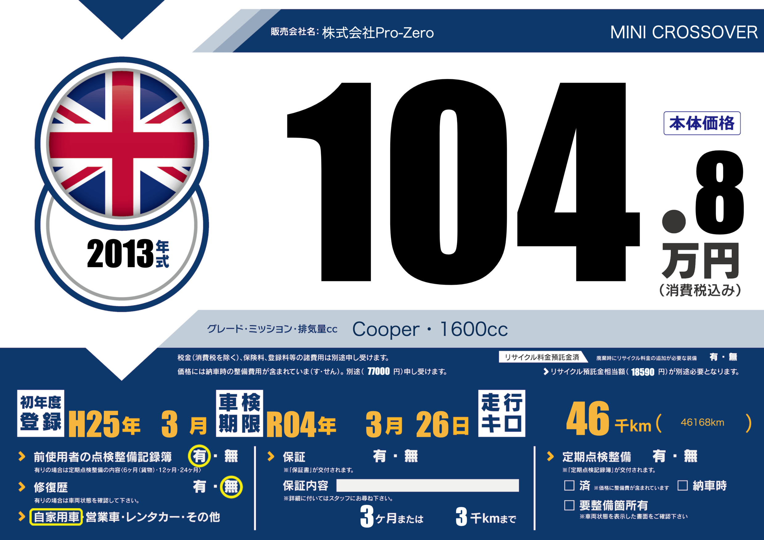| 車名 | MINI CROSSOVER | グレード ミッション 排気量 |