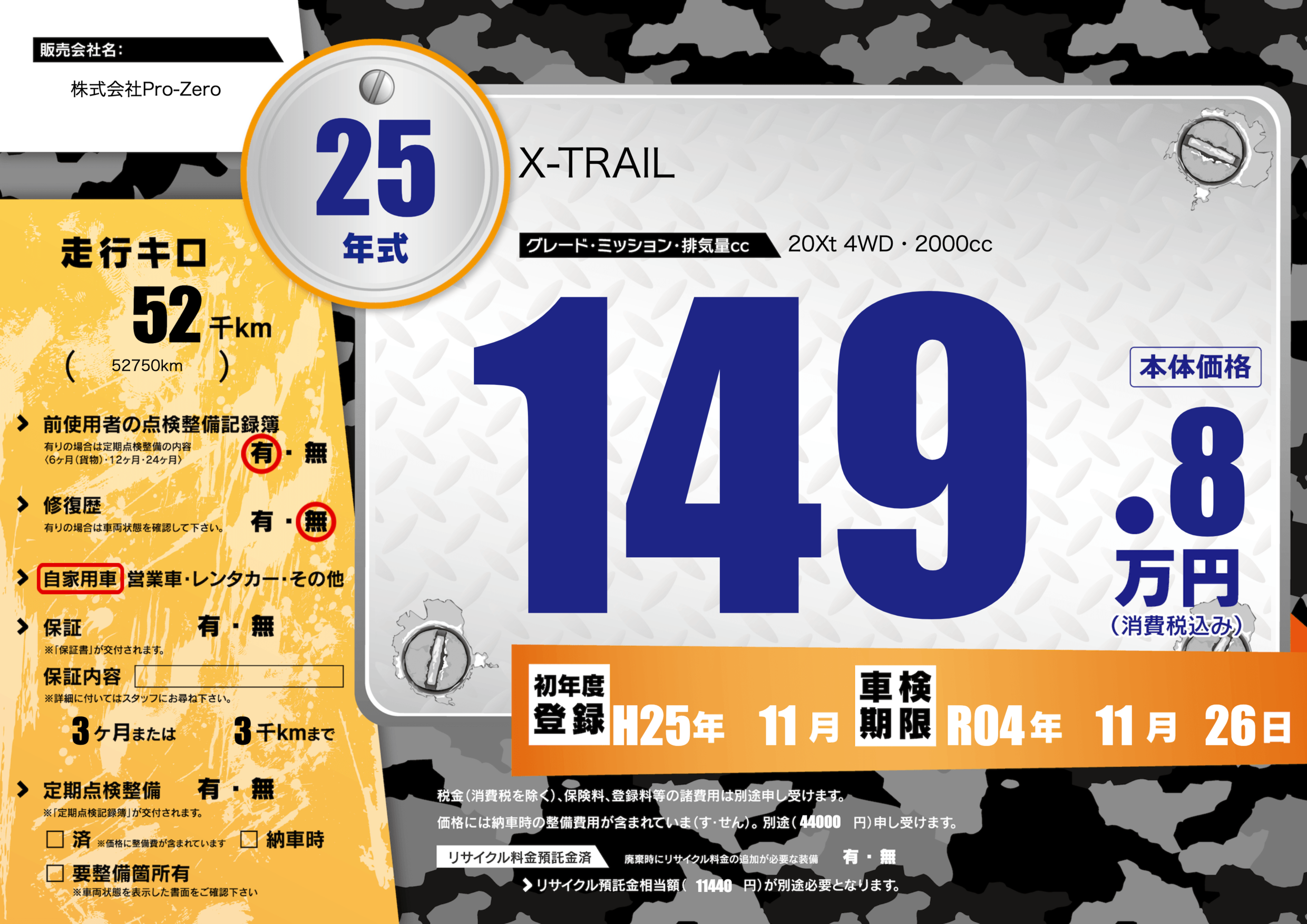 | 車名 | X-TRAIL | グレード ミッション 排気量 |