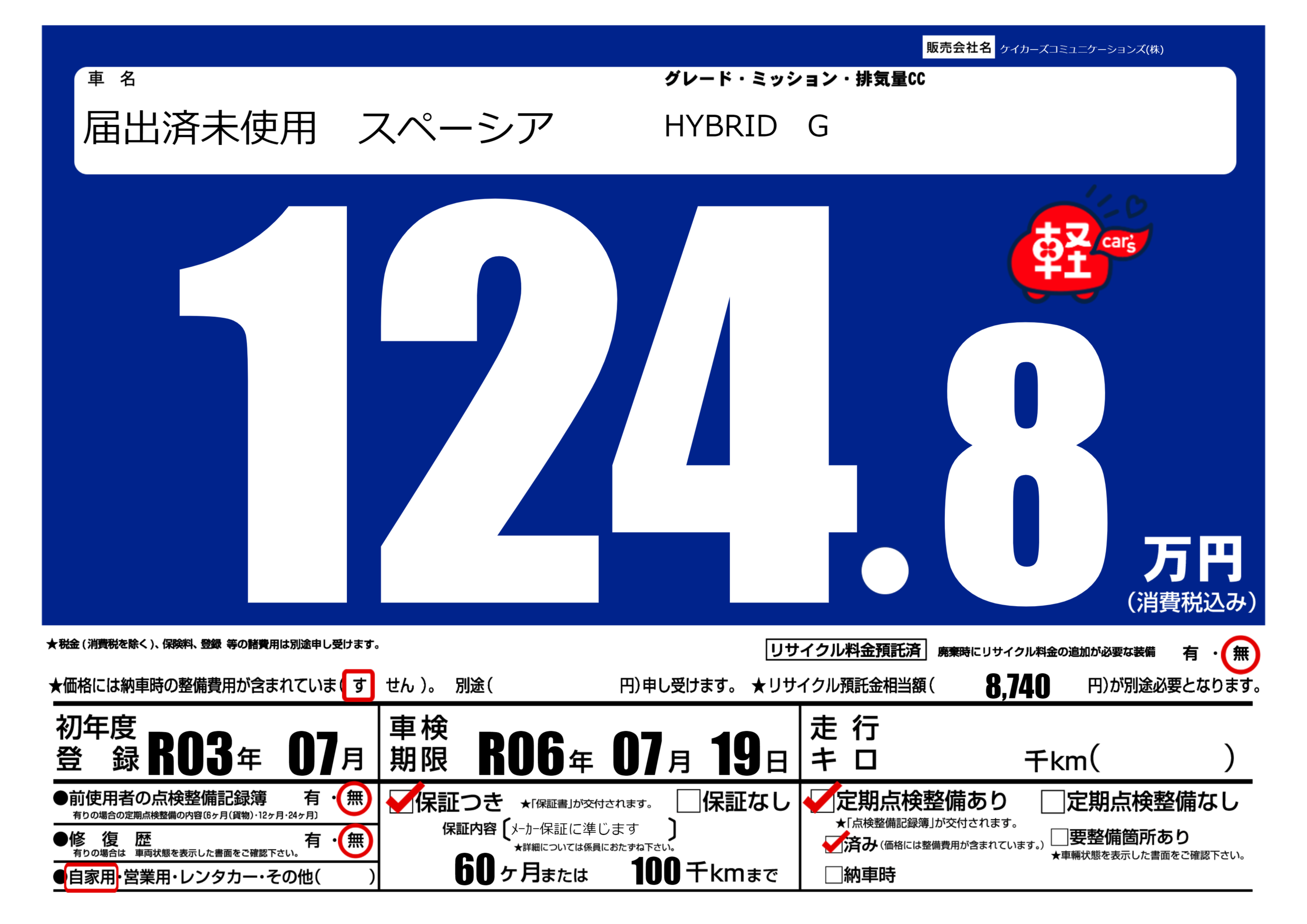 | 定期点検整備 | 定期点検整備あり 定期点検整備済み | ||