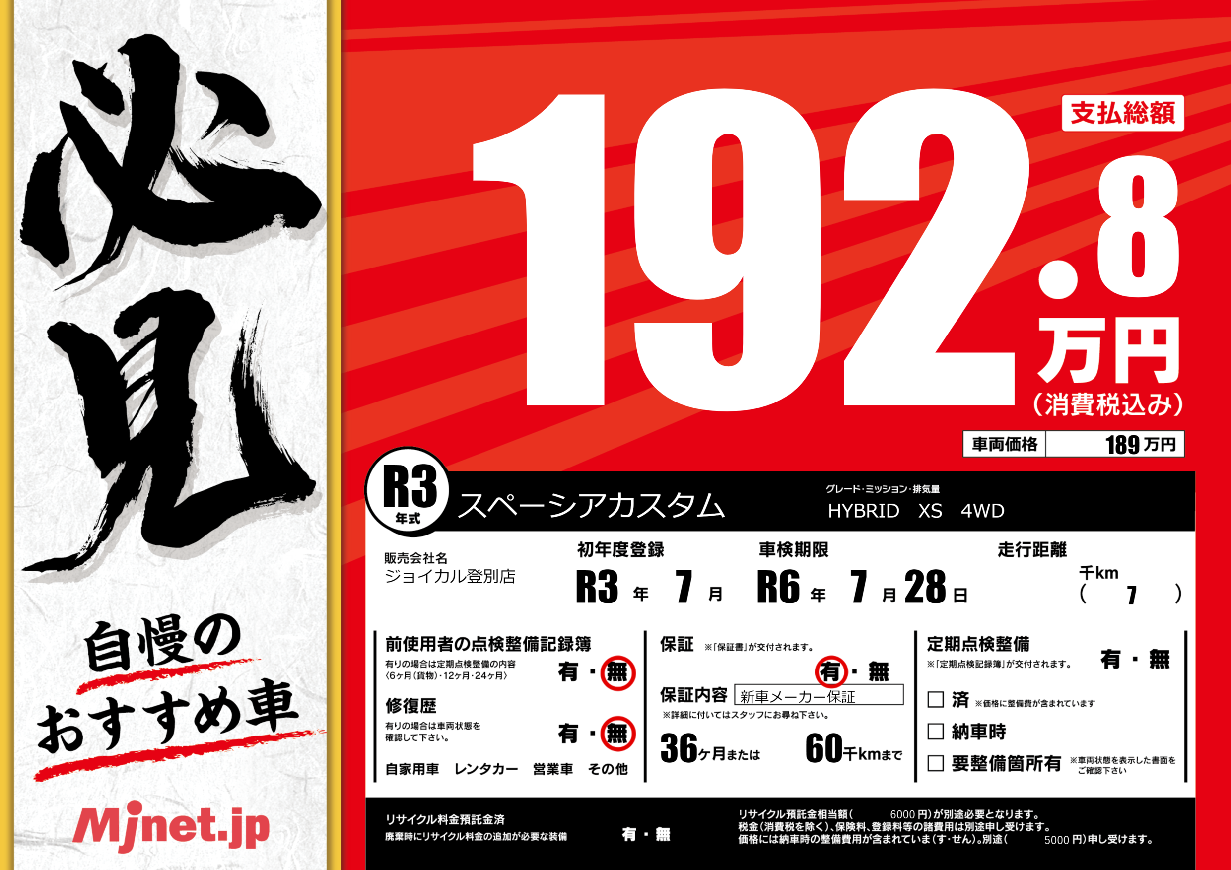 | 車名 | スペーシアカスタム | グレード ミッション 排気量 |