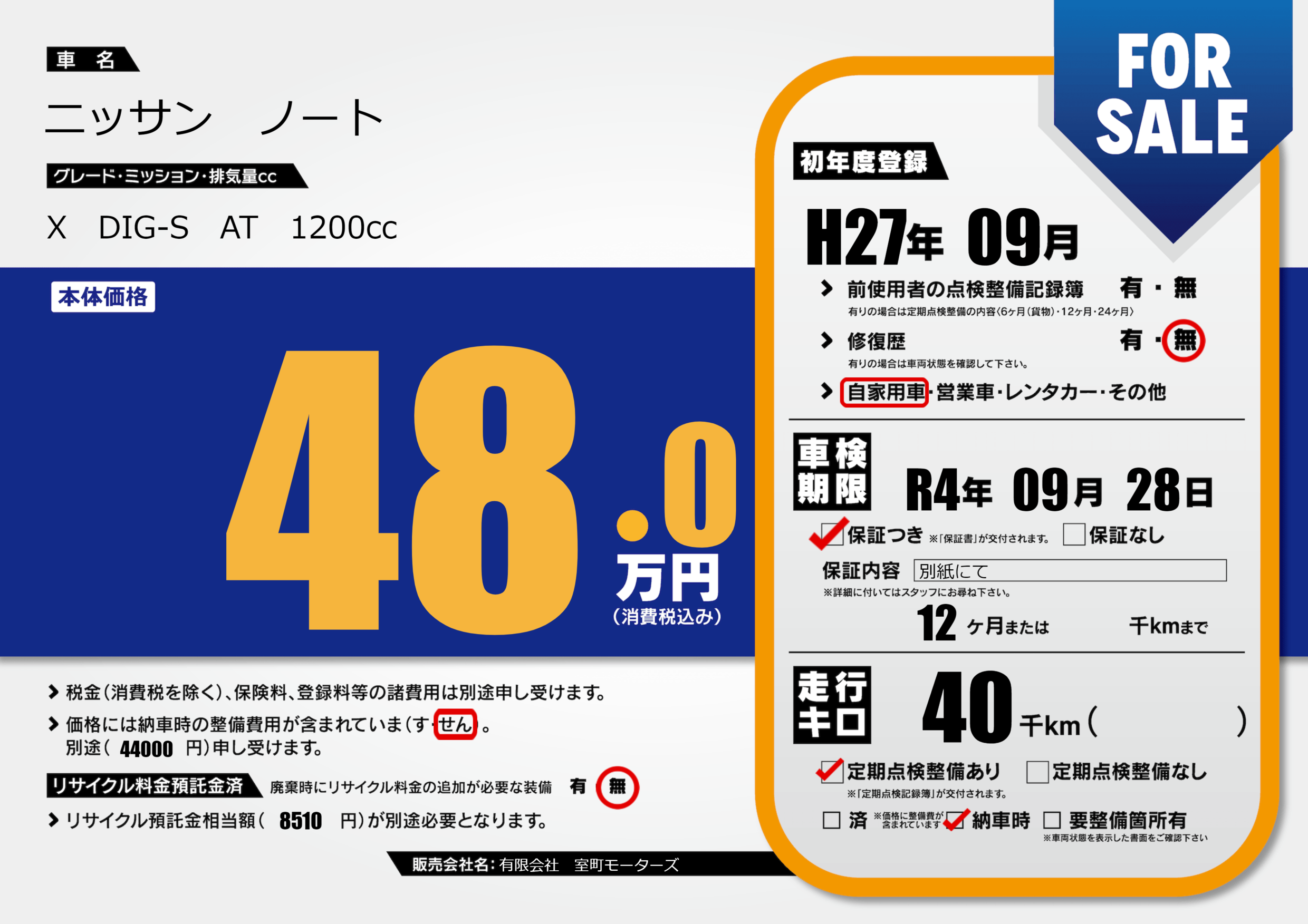 | 車名 | ニッサン ノート | グレード ミッション 排気量 |