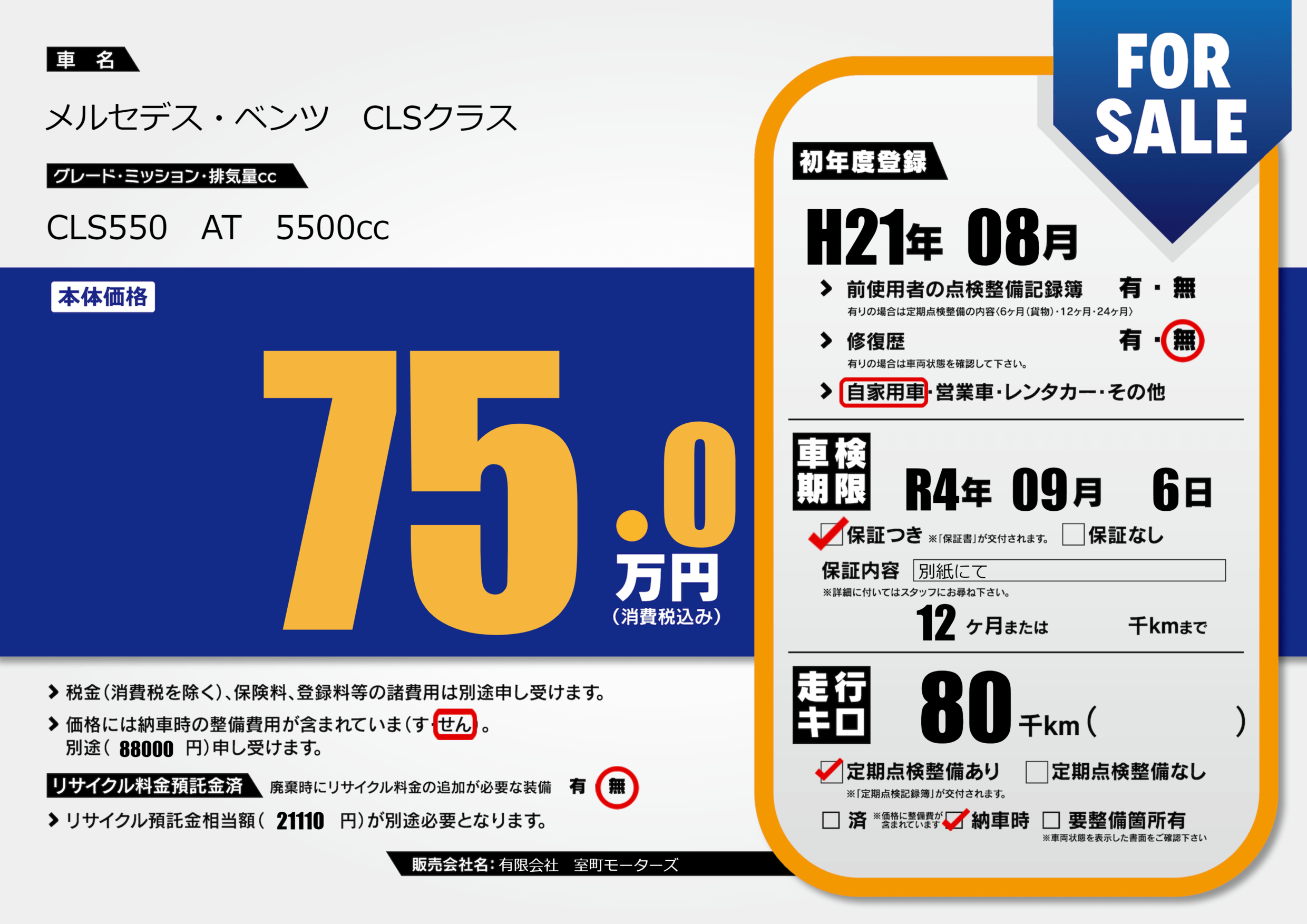 | 車名 | メルセデス・ベンツ CLSクラス | グレード ミッション 排気量 |