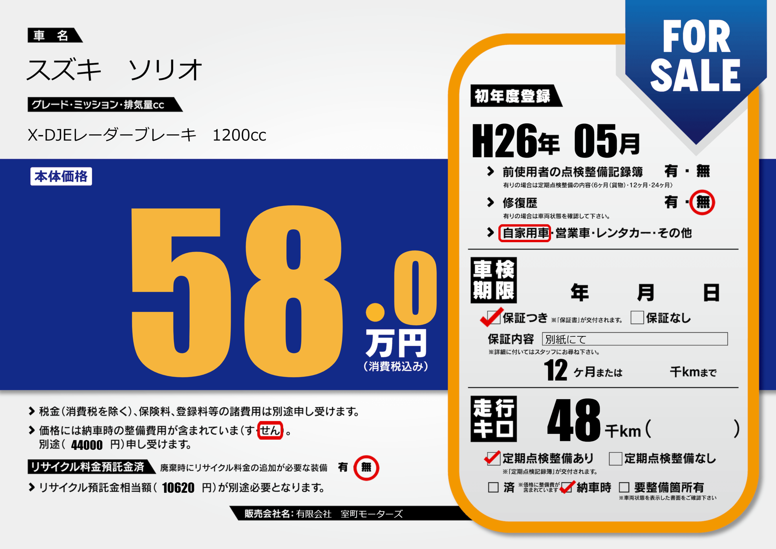 | 車名 | スズキ ソリオ | グレード ミッション 排気量 |