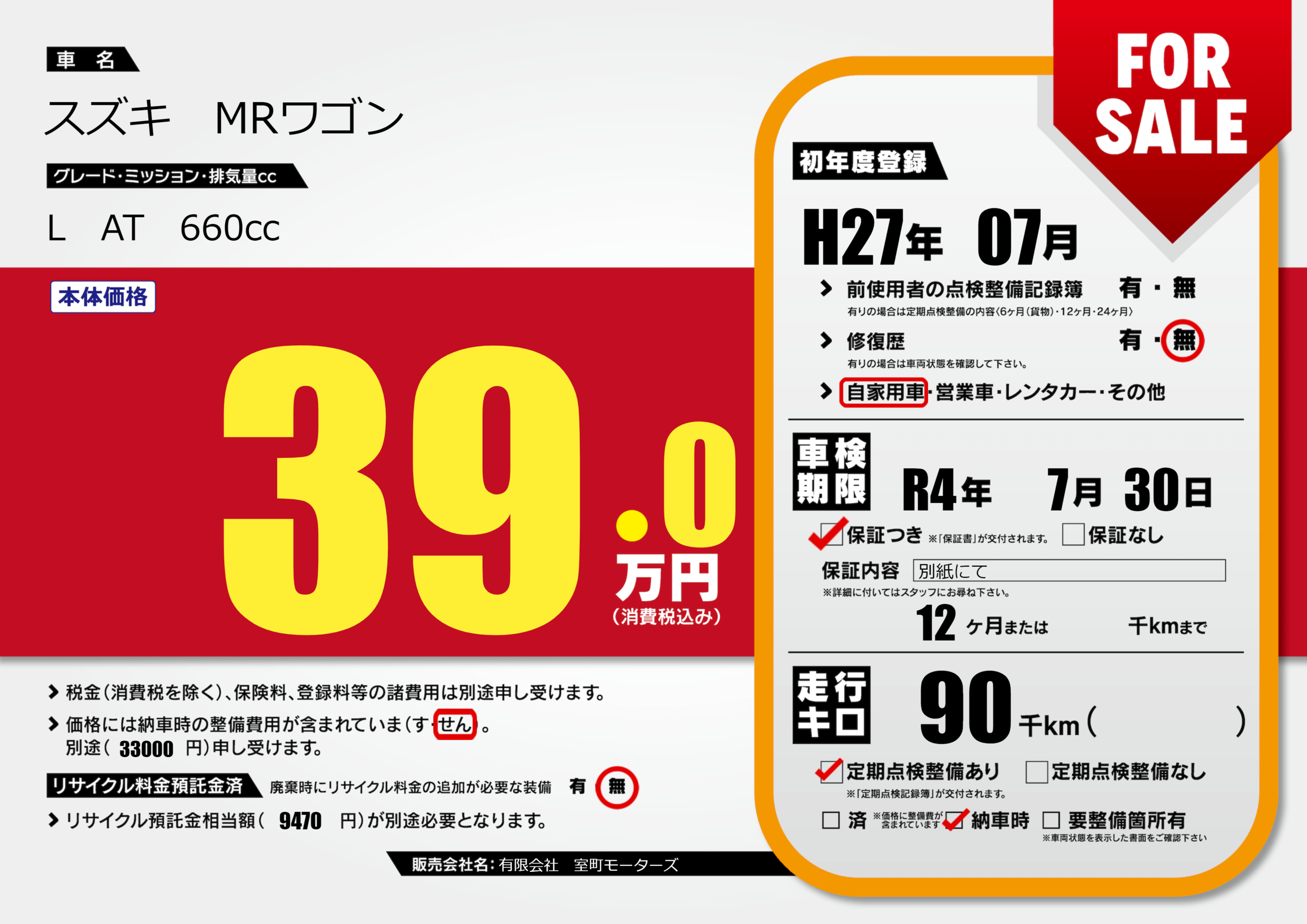 保証付き 保証内容(別紙にて) 12ヶ月または()千kmまで |