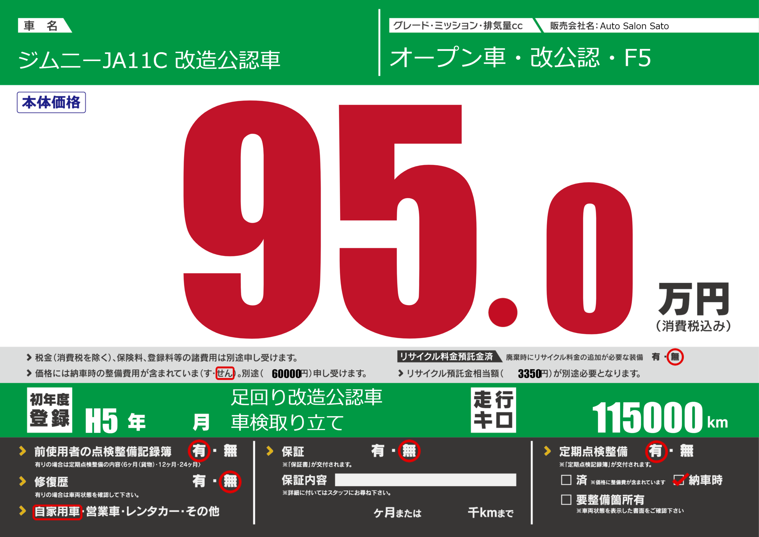| 車名 | ジムニーJA11C 改造公認車 | グレード ミッション 排気量 |