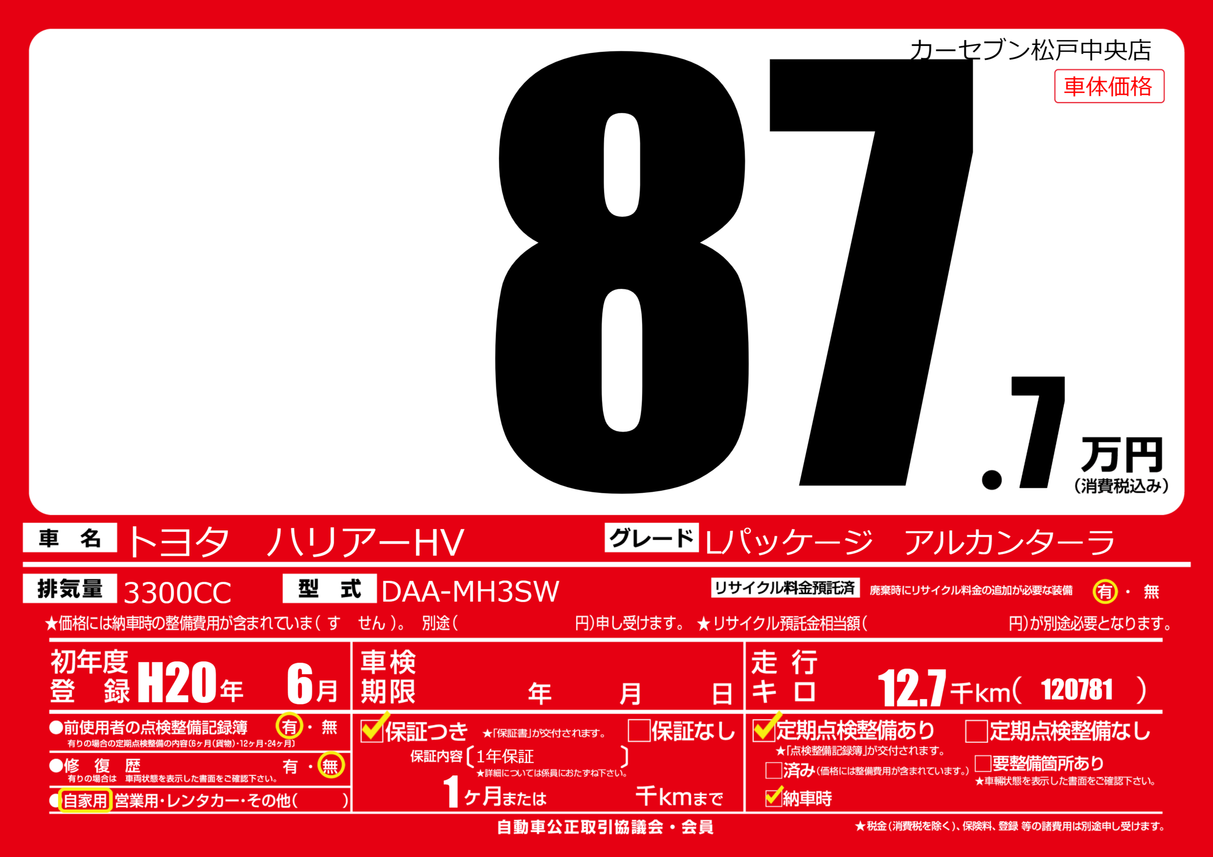 | 走行キロ | 1.2万km | 初年度登録 | H20年6月 |