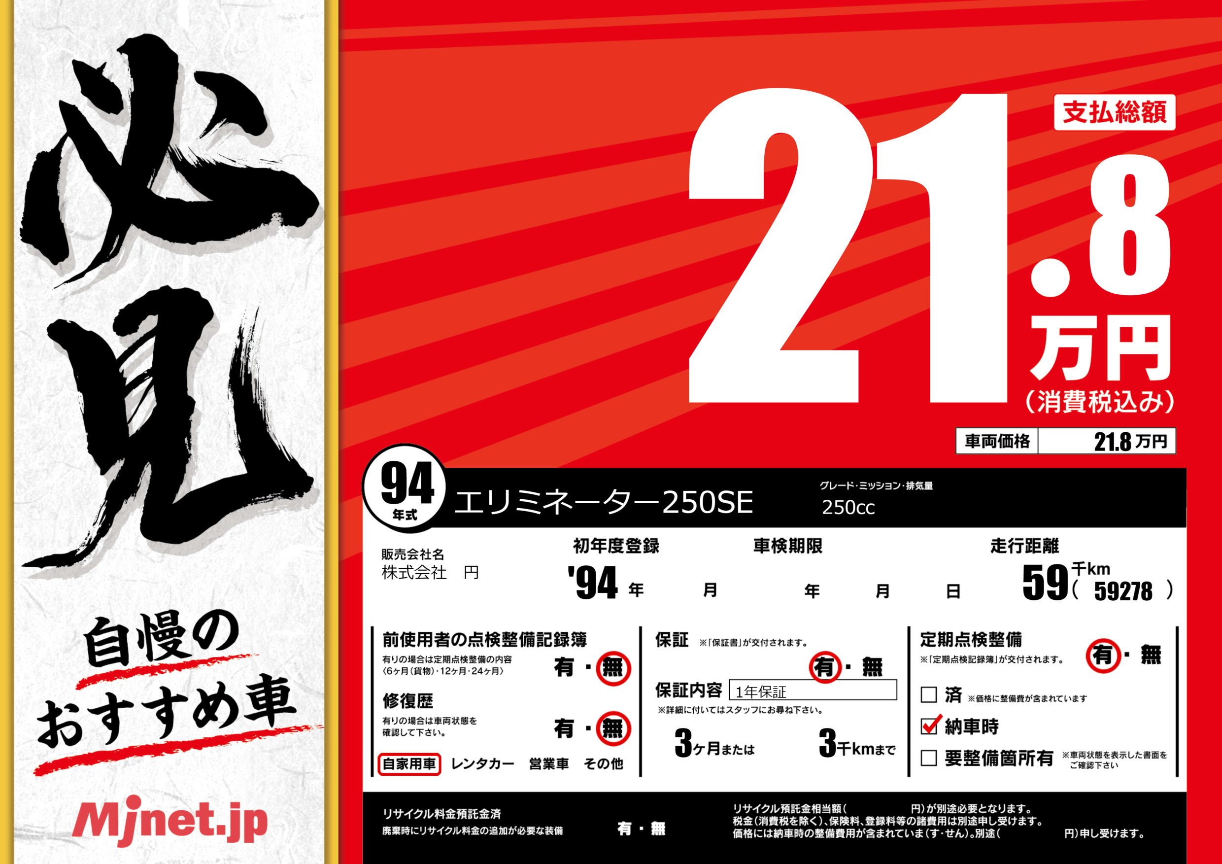 | 車名 | エリミネーター250SE | グレード ミッション 排気量 |