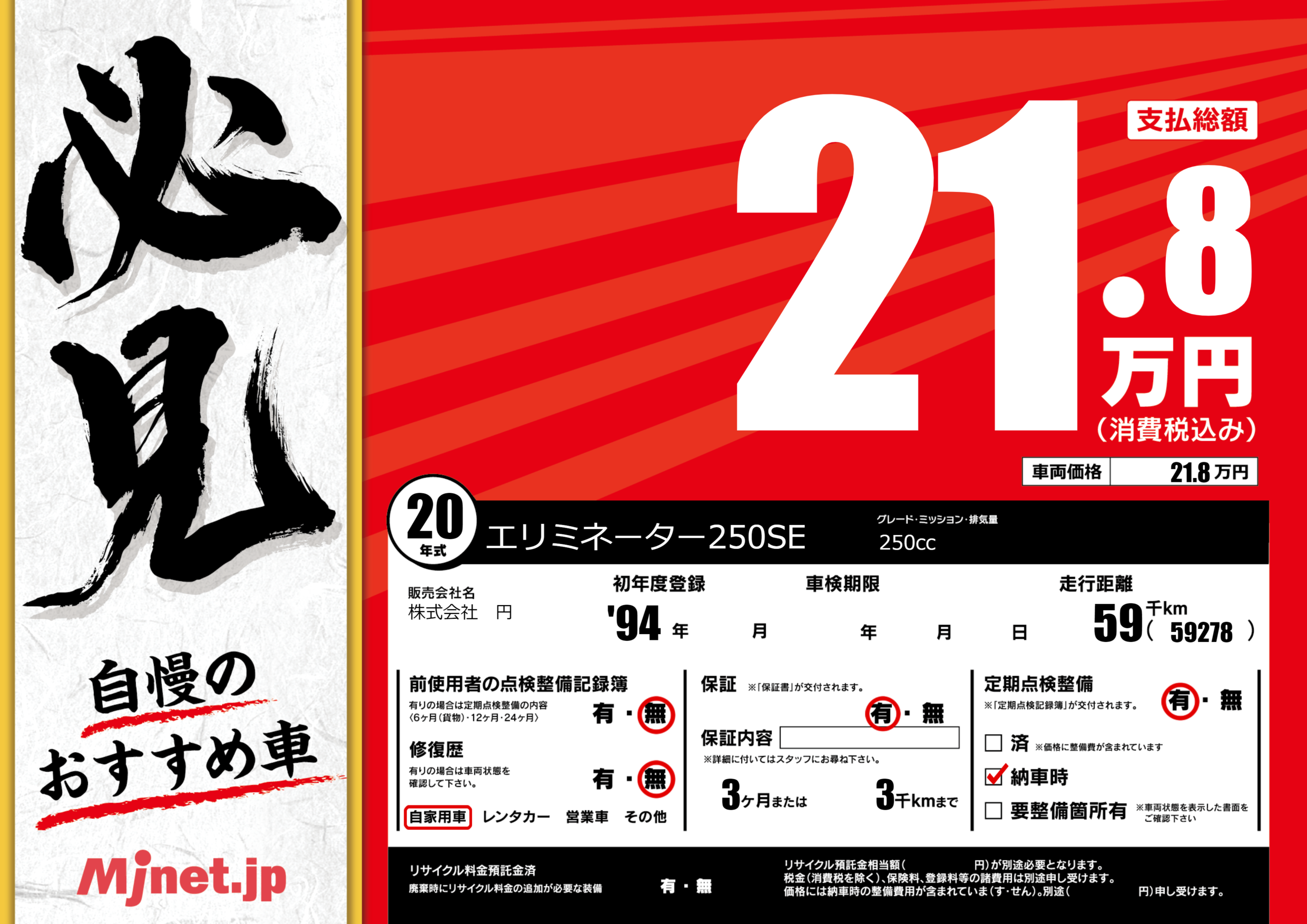 | 車名 | エリミネーター250SE | グレード ミッション 排気量 |