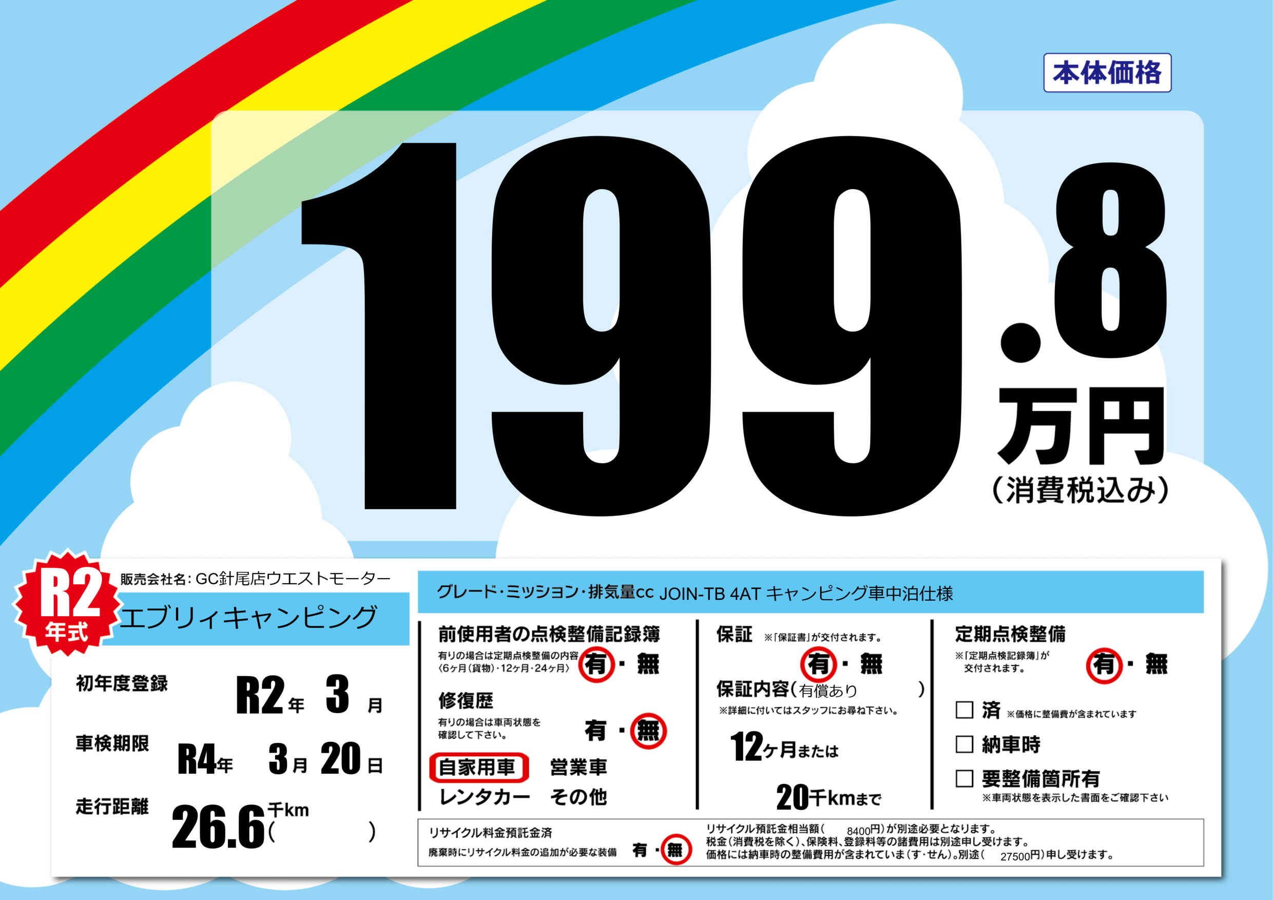 | 車名 | エブリィキャンピング | グレード ミッション 排気量 |