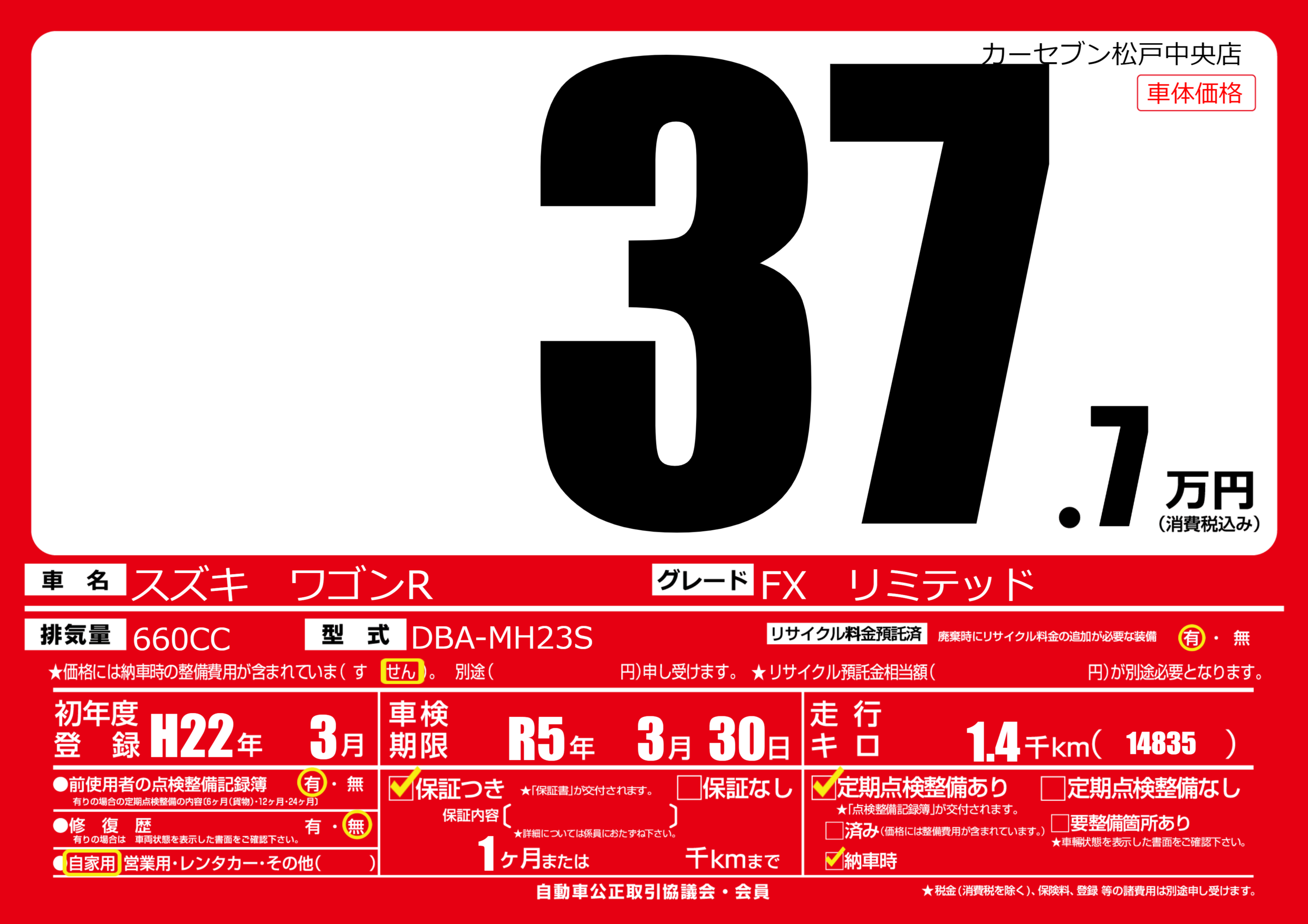 | 走行キロ | 0.1万km | 初年度登録 | H22年3月 |