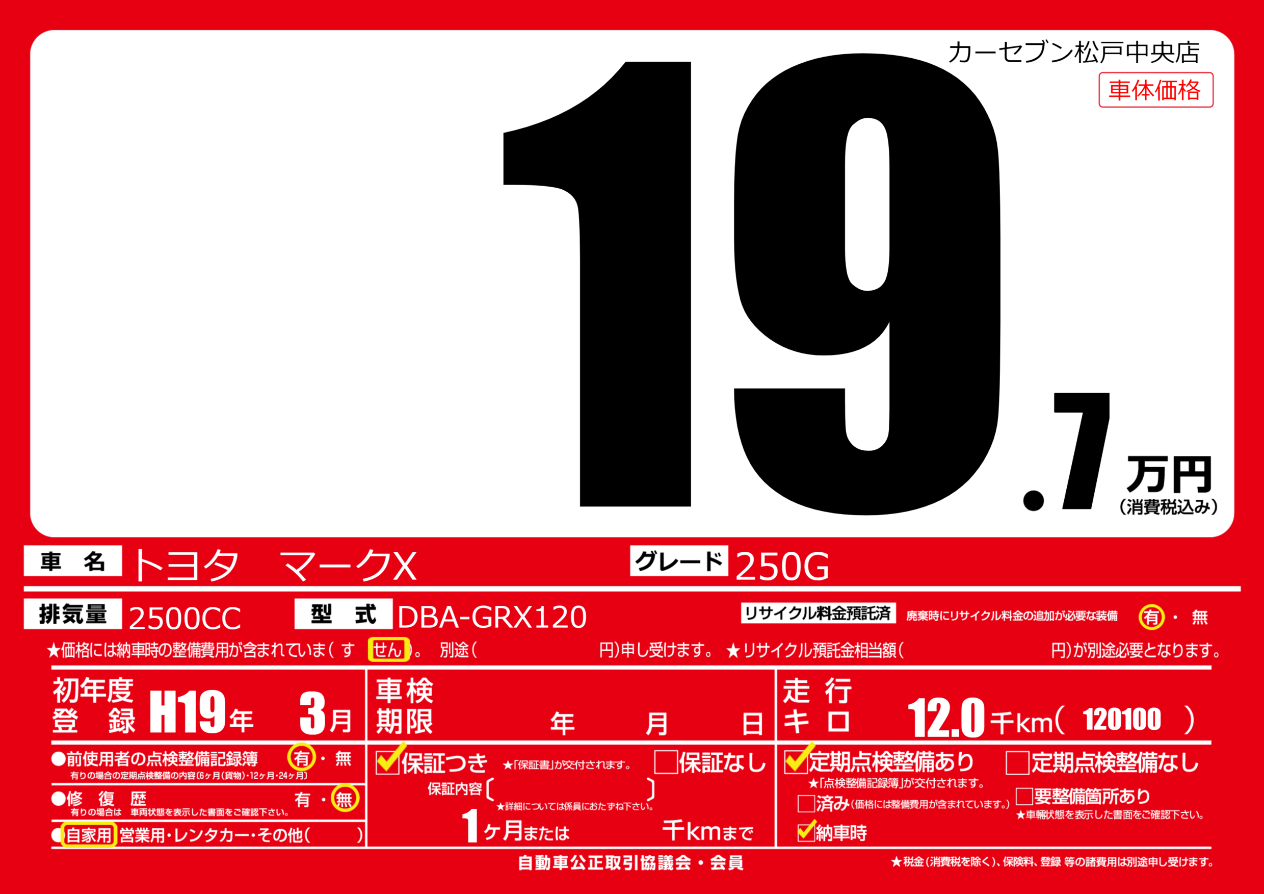 | 走行キロ | 1.2万km | 初年度登録 | H19年3月 |