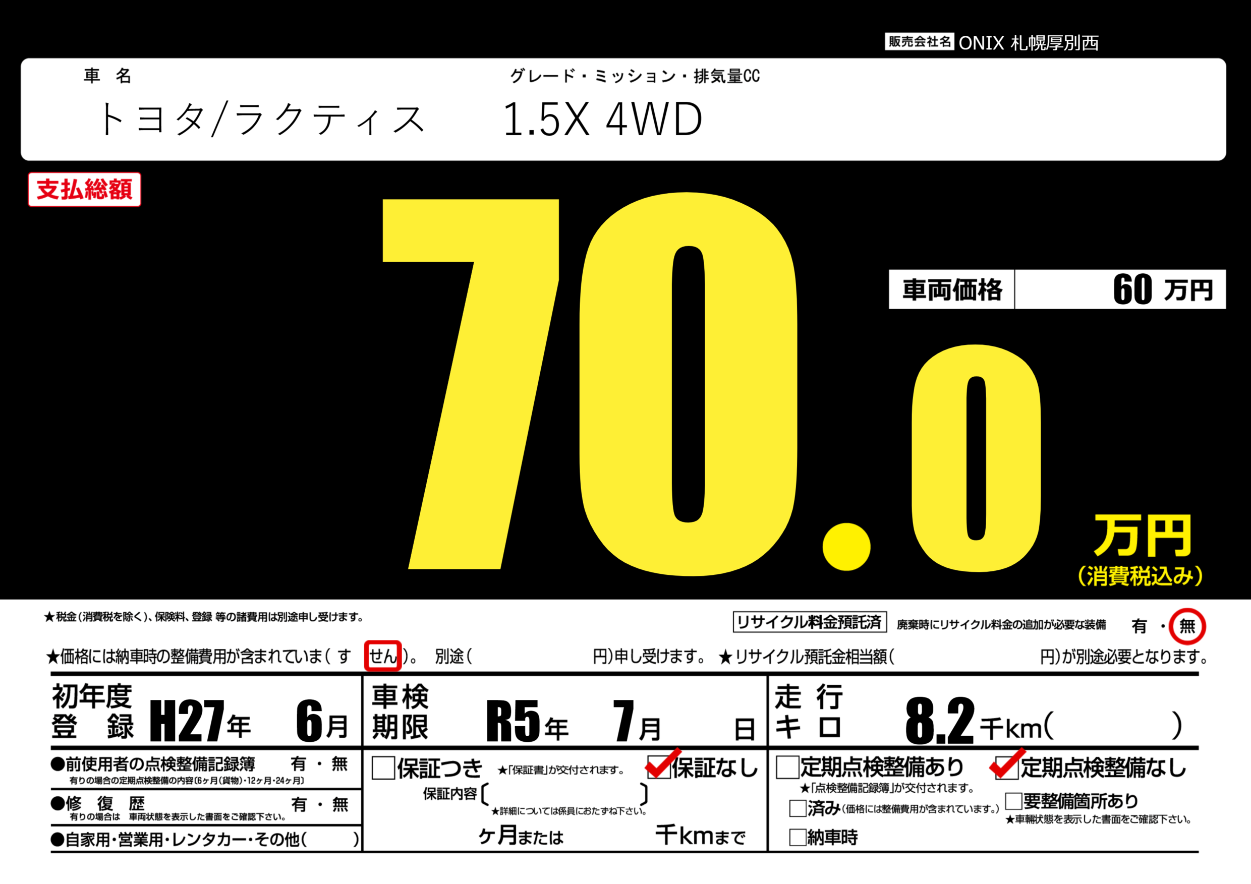 なし | リサイクル預託金相当額 | ( 0円)が別途必要 |