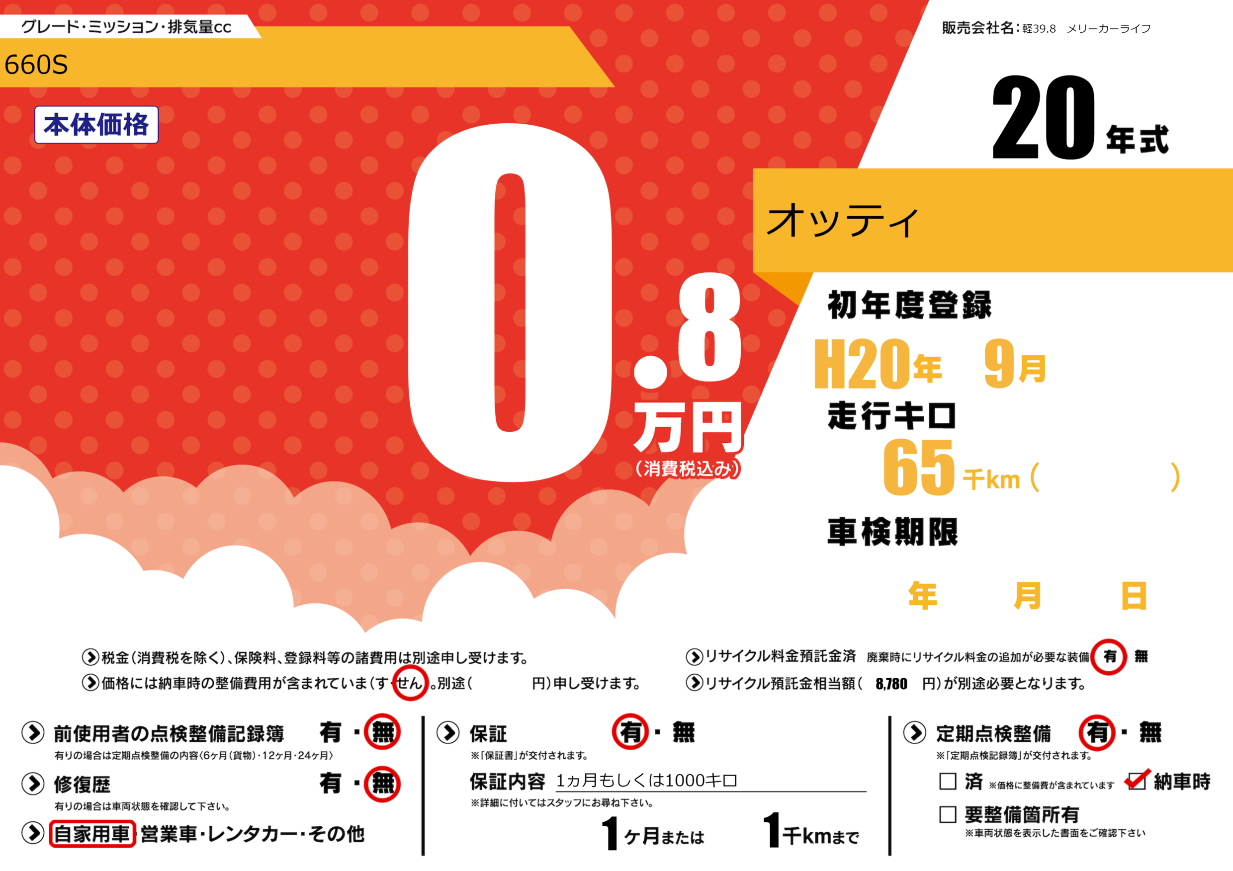 | 車名 | オッティ | グレード ミッション 排気量 |