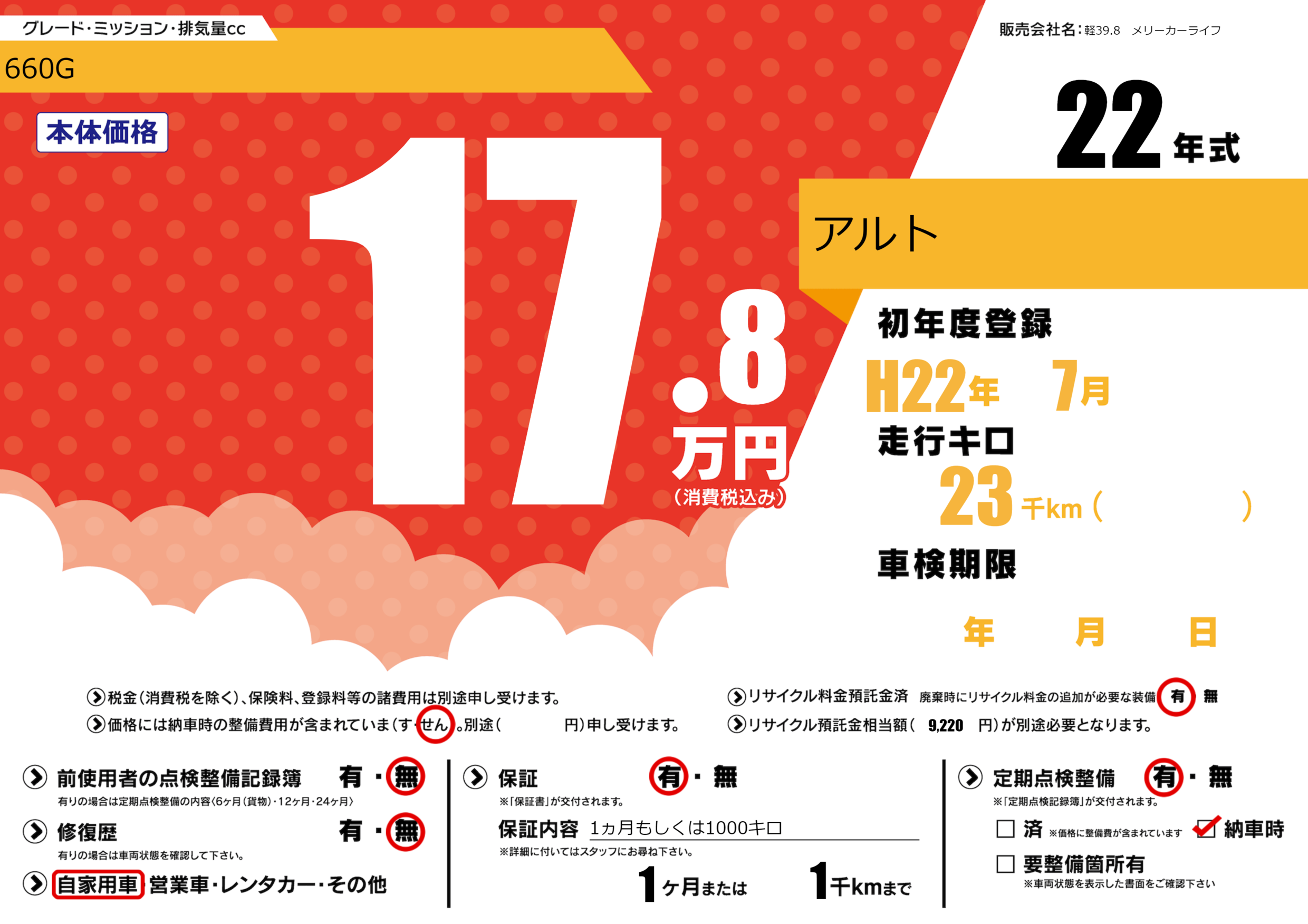 | 定期点検整備 | 定期点検整備あり 納車時あり | ||