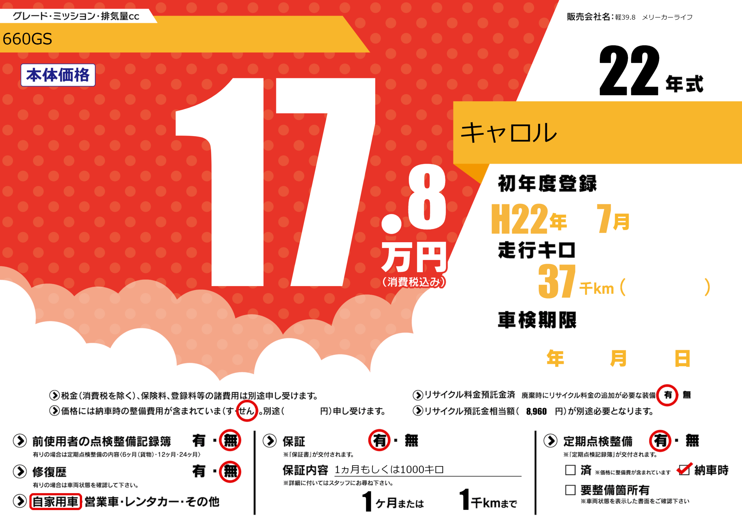 | 車名 | キャロル | グレード ミッション 排気量 |