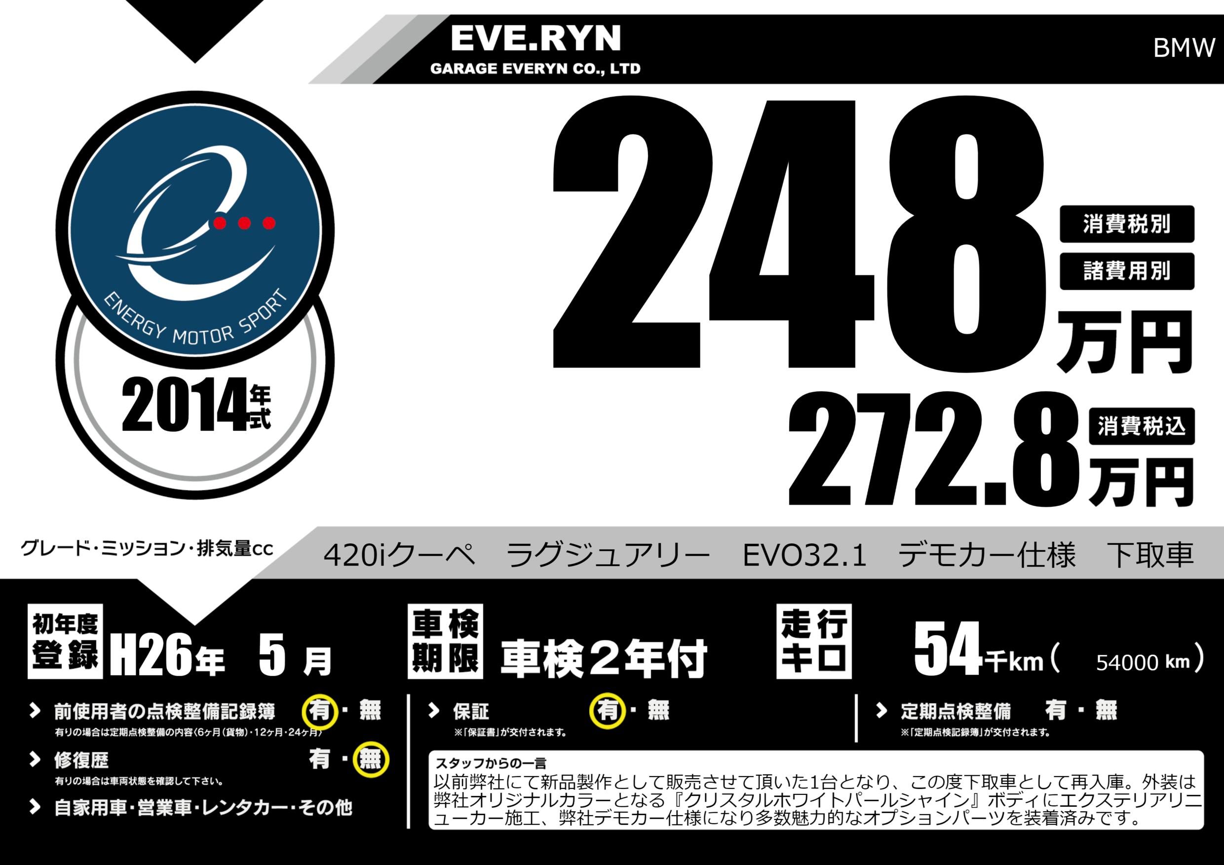 420iクーペ ラグジュアリー EVO32.1 デモカー仕様 下取車 |