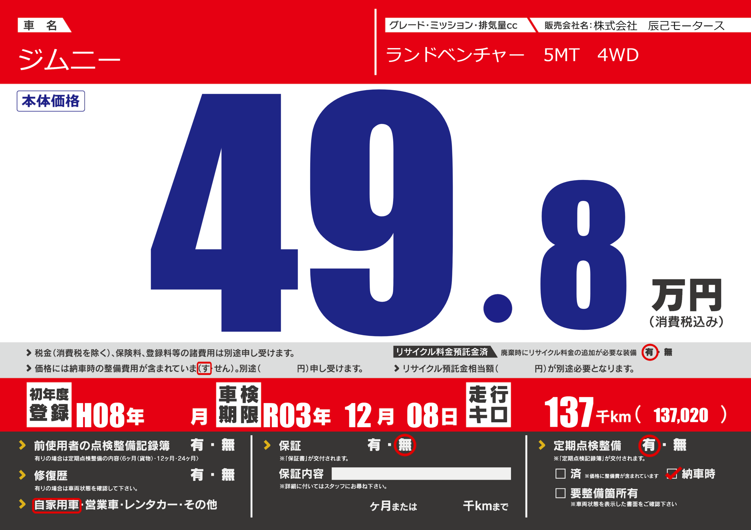 | 車名 | ジムニー | グレード ミッション 排気量 |